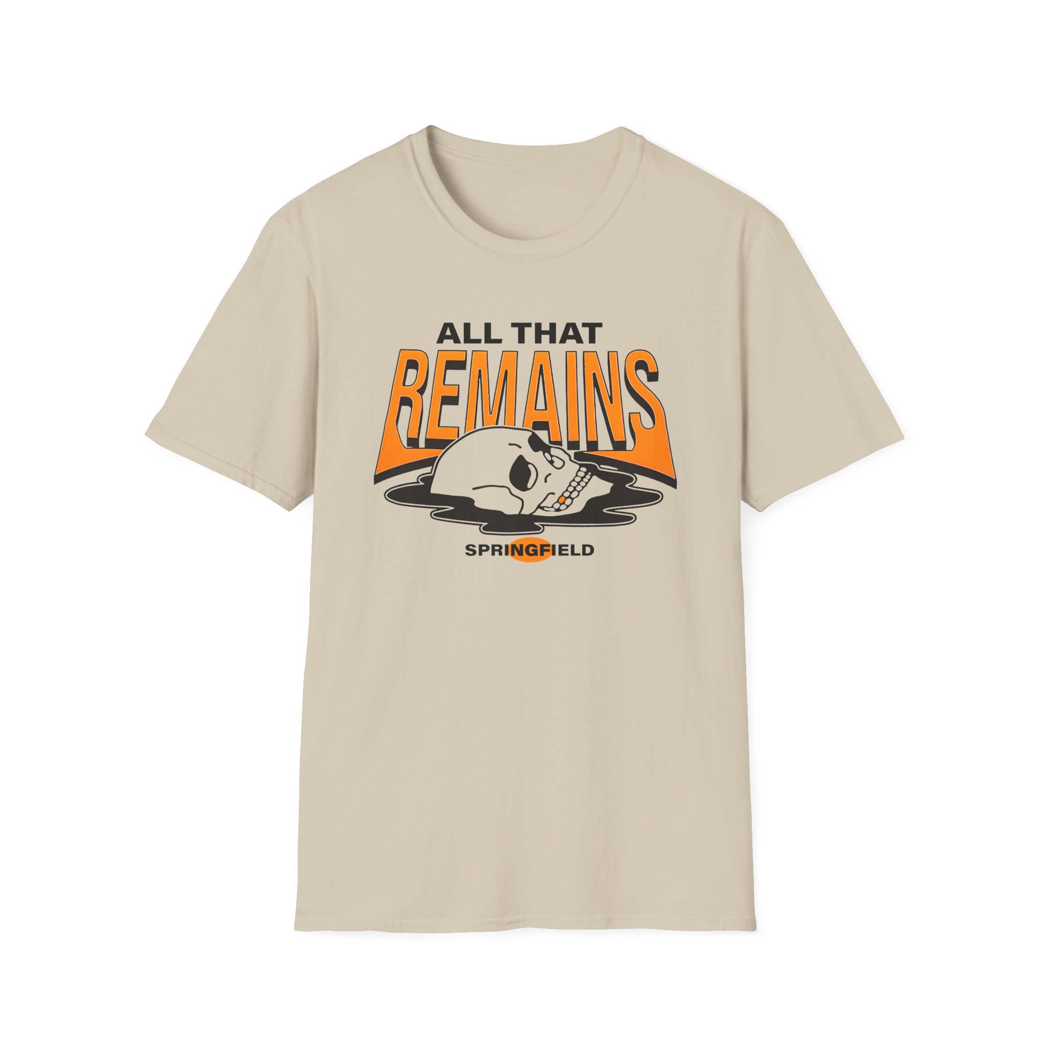 The All That Remains Springfield Skull unisex soft-style t-shirt puts a new spin on casual comfort. Made from very soft materials, this tee is 100% cotton for solid colors. Heather colors and sports grey include polyester. The shoulders have twill tape for improved durability. There are no side seams. The collar is made with ribbed knitting to prevent curling damage.