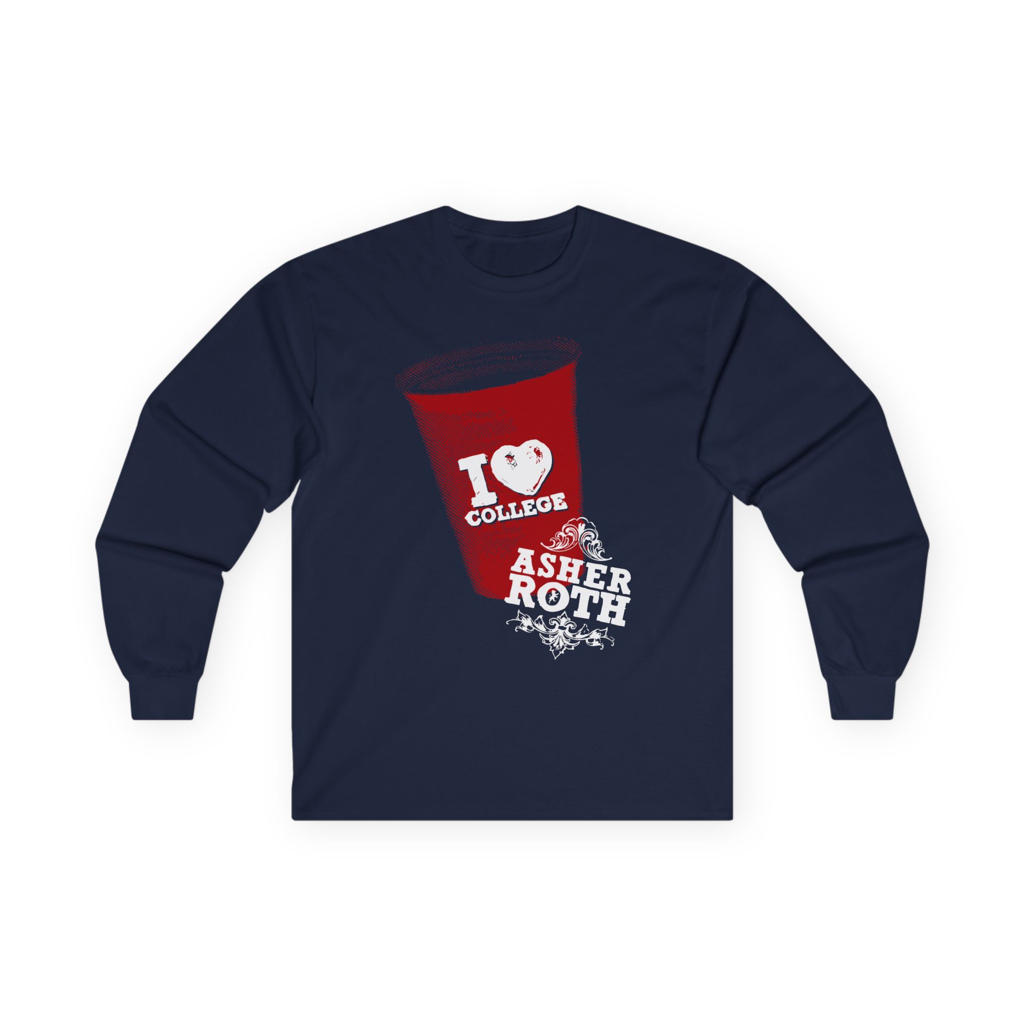A bit more formal than a standard-issue t-shirt, the Asher Roth I Love College ultra cotton long sleeve tee is a clear comfort winner. The sleeves also act as a nice frame. There are no side seams. The shoulders are taped for improved durability. This makes for a good fitting around the shoulders and neck. The cotton used for these shirts is environmentally friendly.