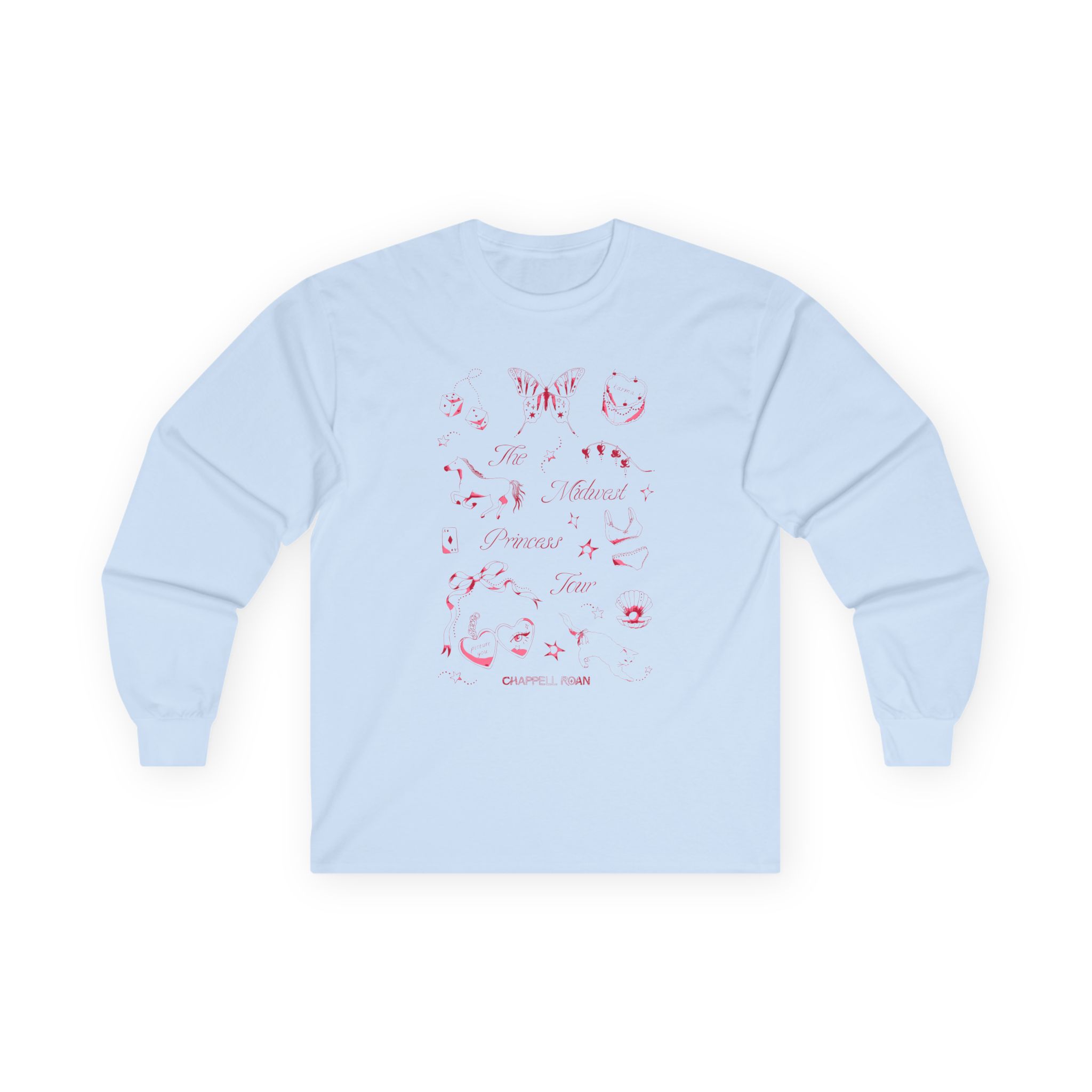 A bit more formal than a standard-issue t-shirt, the Chappell Roan The Midwest Princess Tour ultra cotton long sleeve tee is a clear comfort winner. The sleeves also act as a nice frame. There are no side seams. The shoulders are taped for improved durability. This makes for a good fitting around the shoulders and neck. The cotton used for these shirts is environmentally friendly.