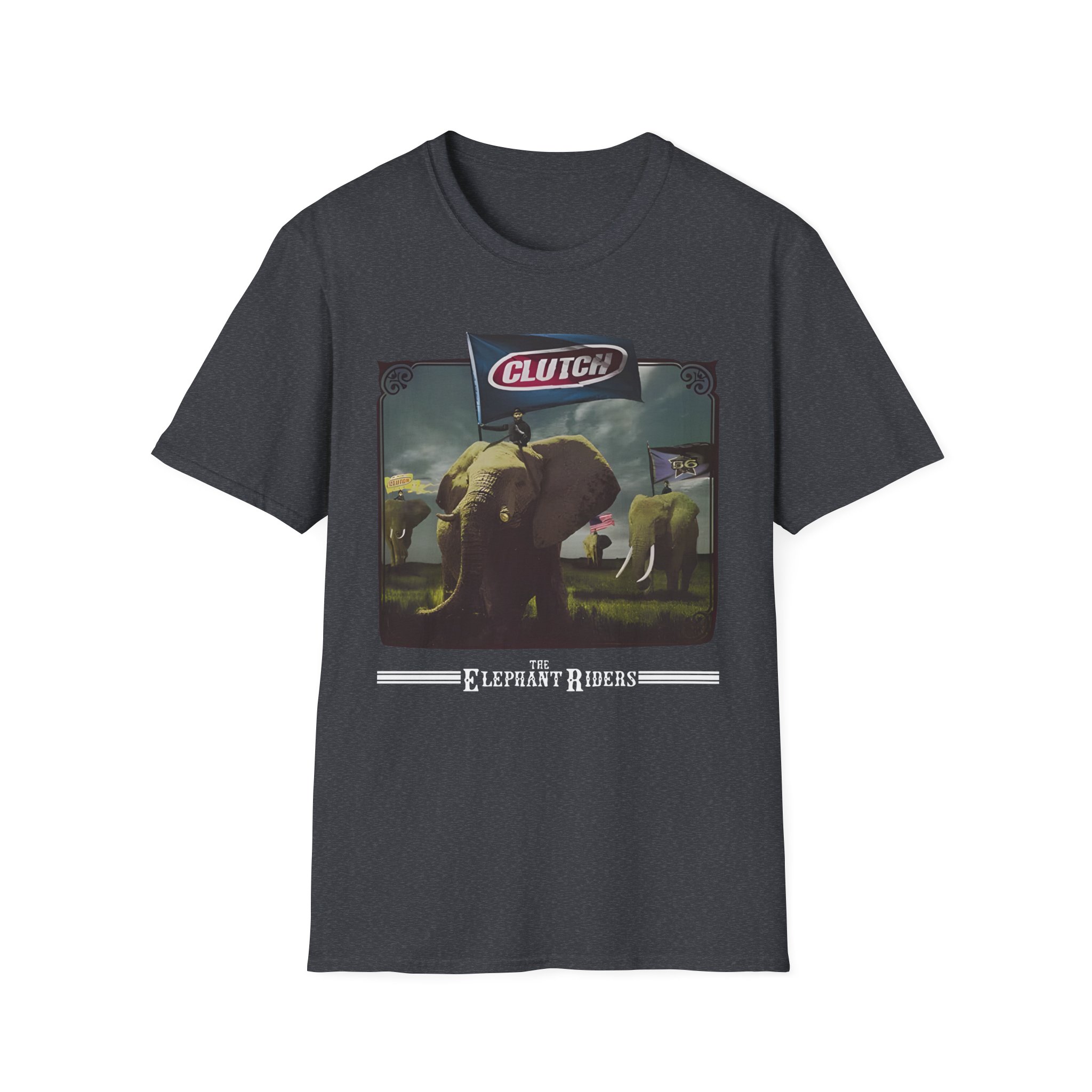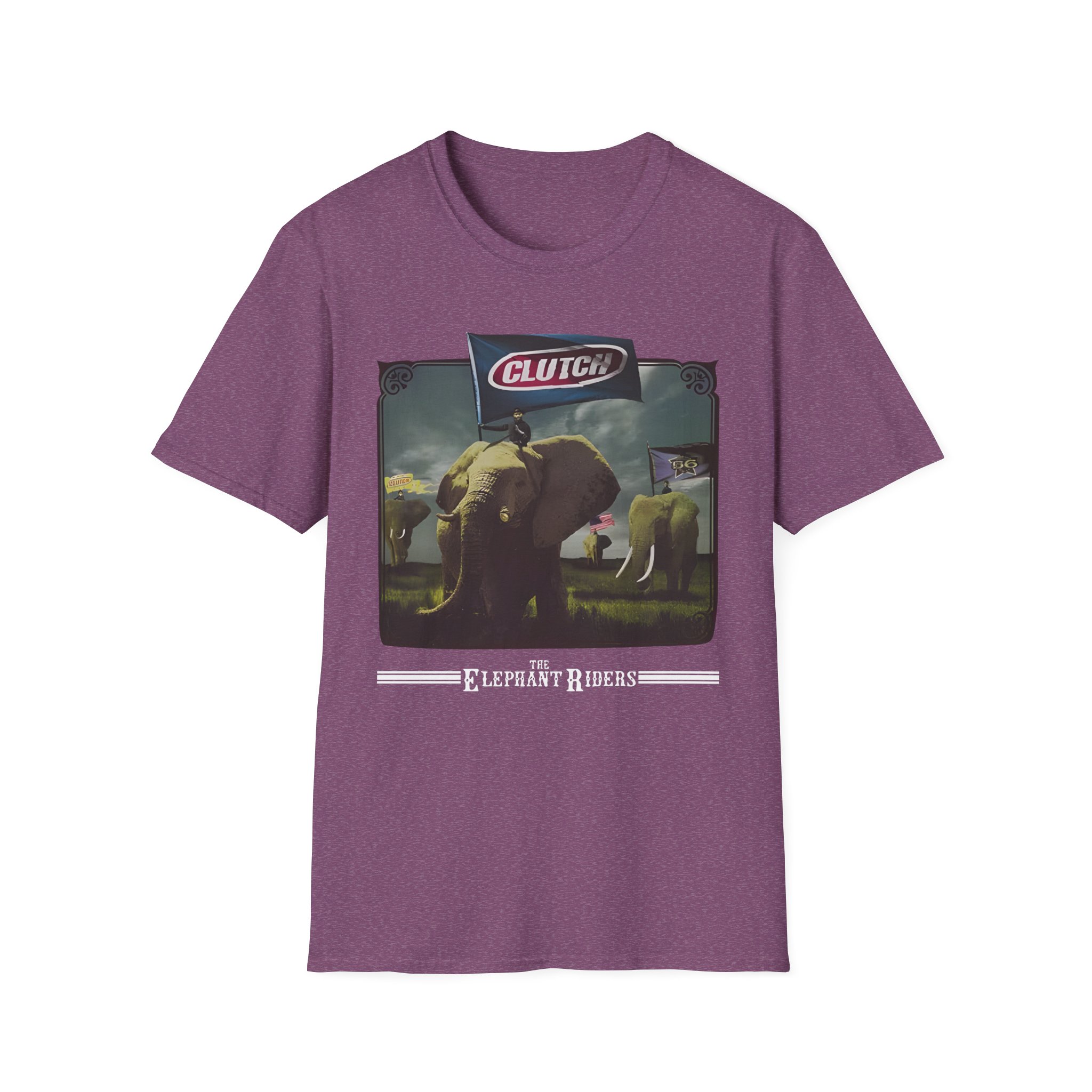 The Clutch Elephant Riders unisex soft-style t-shirt puts a new spin on casual comfort. Made from very soft materials, this tee is 100% cotton for solid colors. Heather colors and sports grey include polyester. The shoulders have twill tape for improved durability. There are no side seams. The collar is made with ribbed knitting to prevent curling damage.
