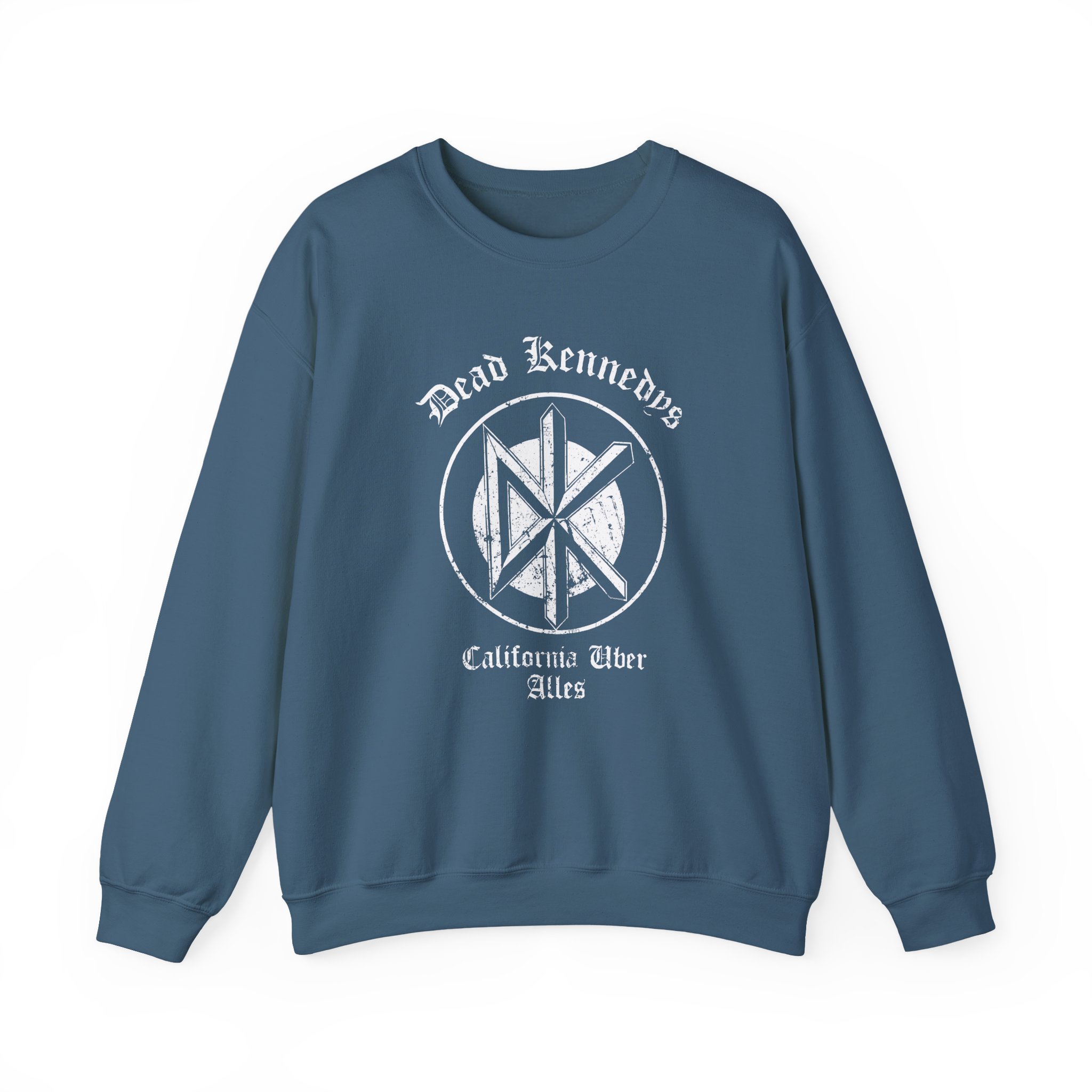 Ideal for any situation, a Dead Kennedys alifornia Uber Alles unisex heavy blend crewneck sweatshirt is pure comfort. These garments are made from polyester and cotton. This combination helps designs come out looking fresh and beautiful. The collar is ribbed knit, so it retains its shape even after washing. There are no itchy side seams on these sweaters.