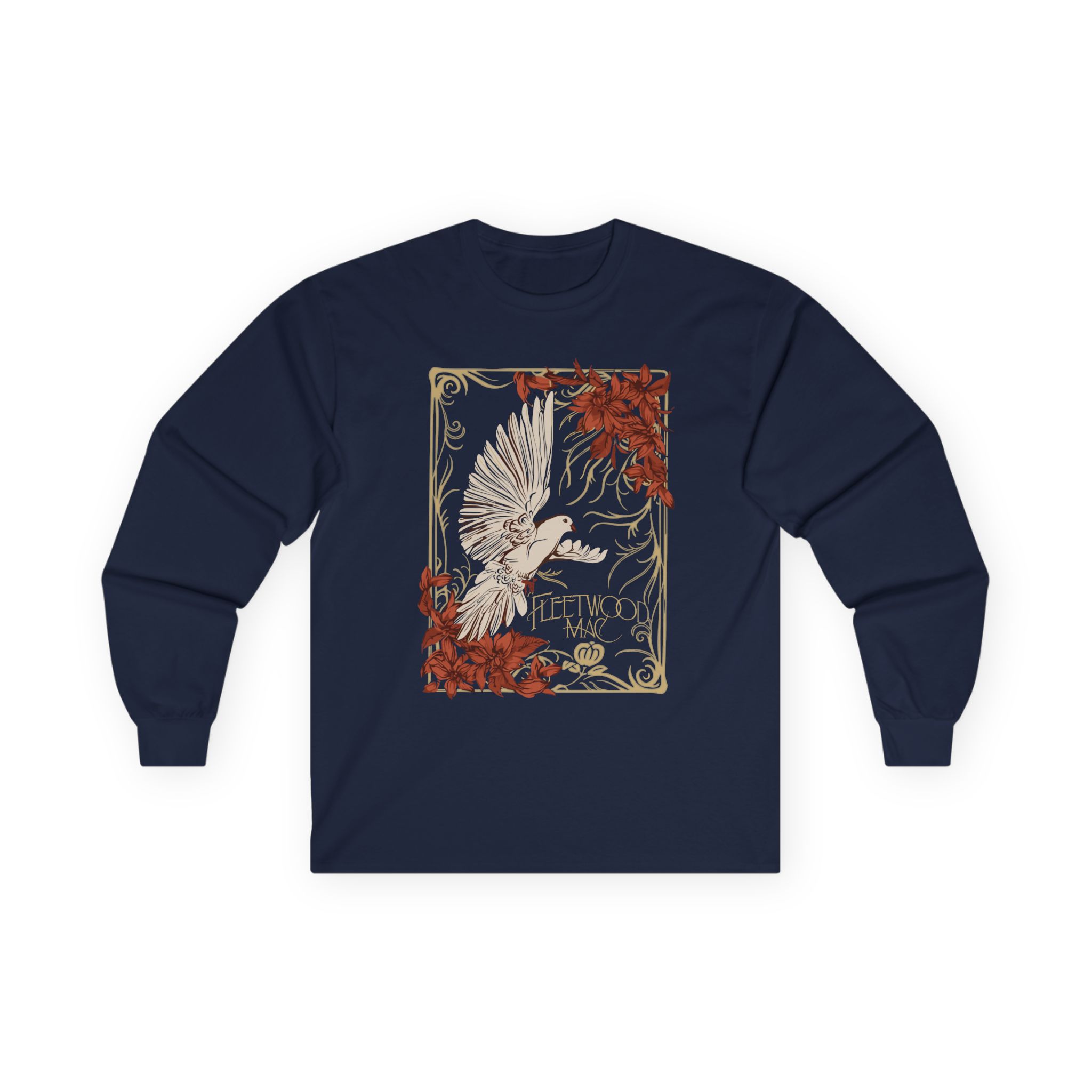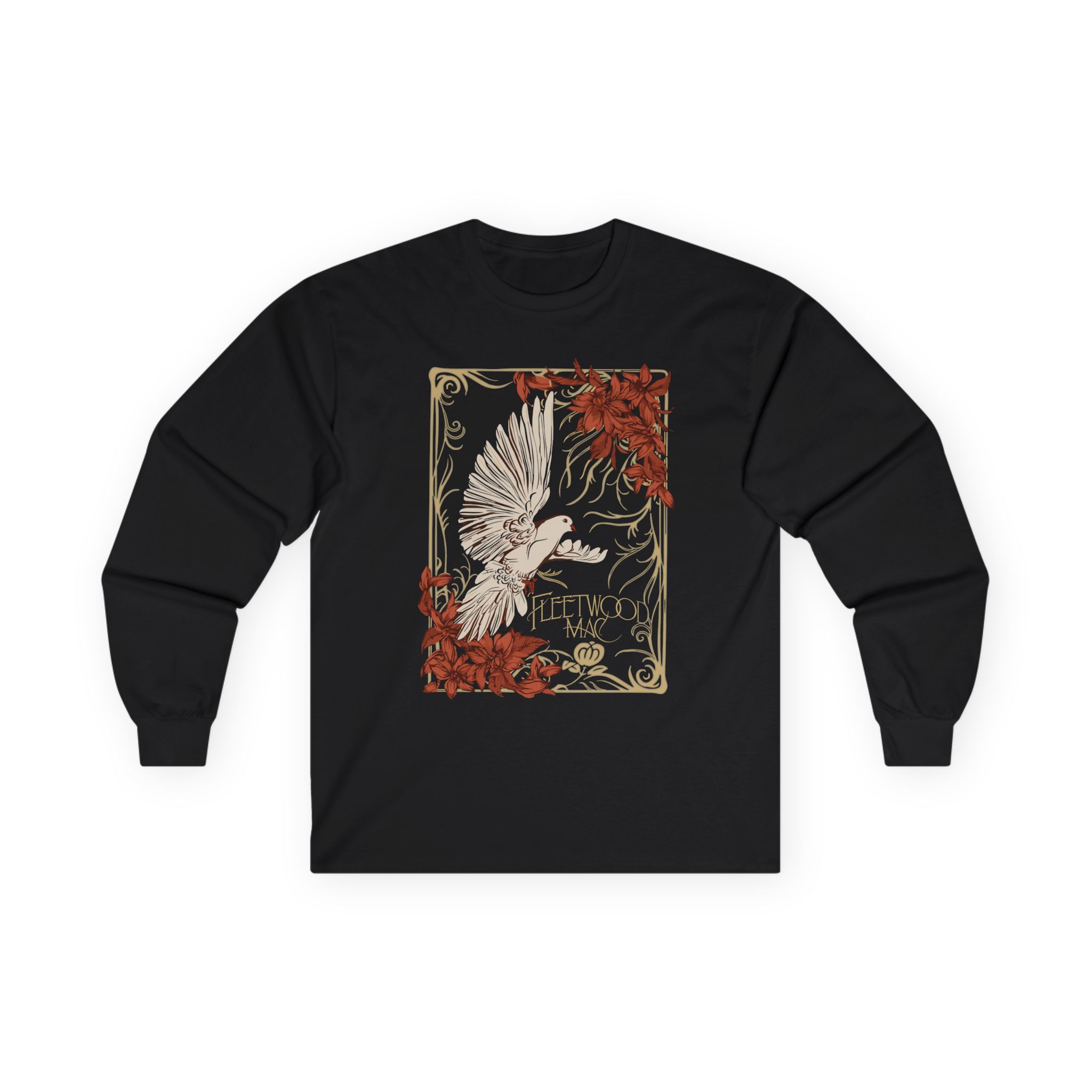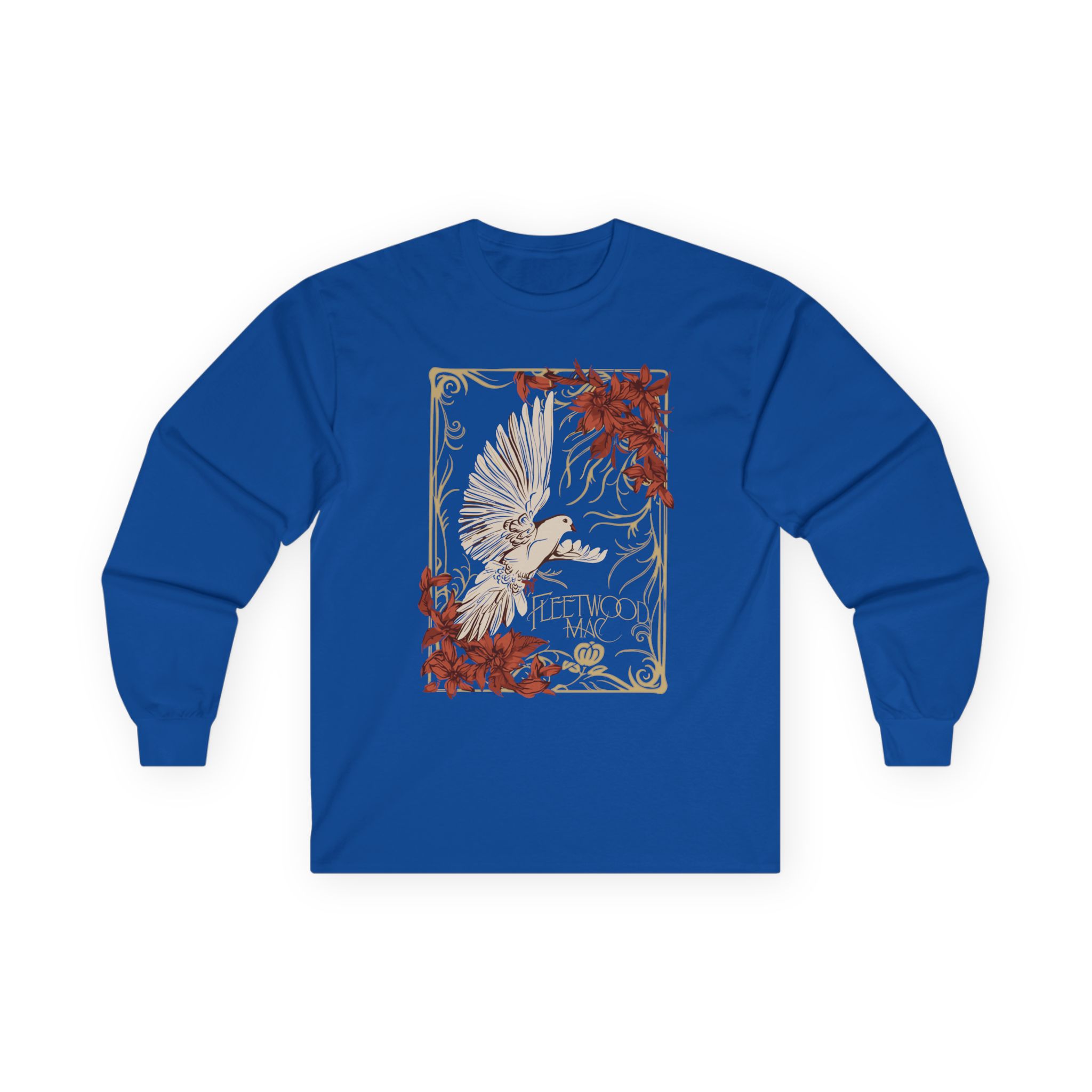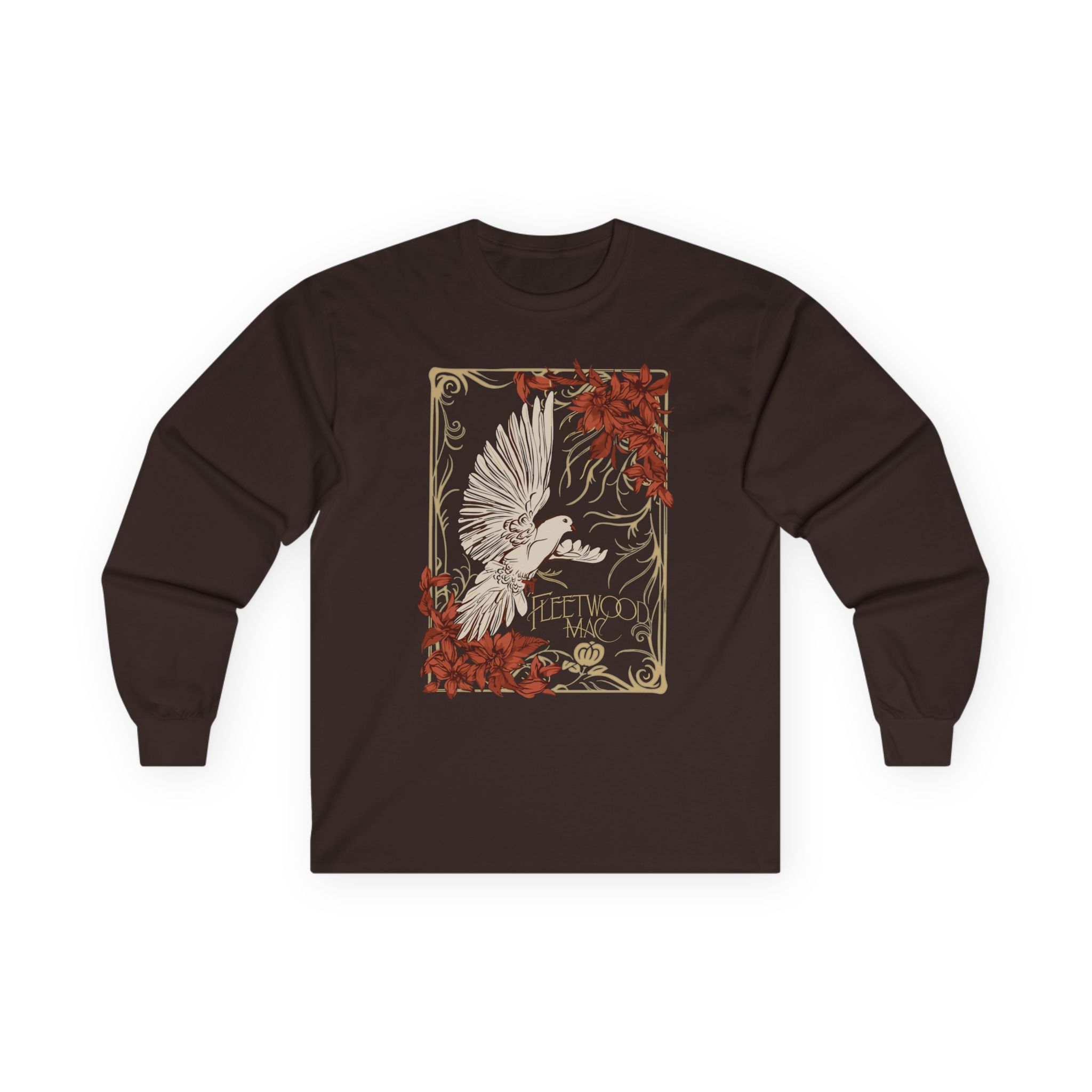A bit more formal than a standard-issue t-shirt, the Fleetwood Mac Dove ultra cotton long sleeve tee is a clear comfort winner. The sleeves also act as a nice frame. There are no side seams. The shoulders are taped for improved durability. This makes for a good fitting around the shoulders and neck. The cotton used for these shirts is environmentally friendly.
