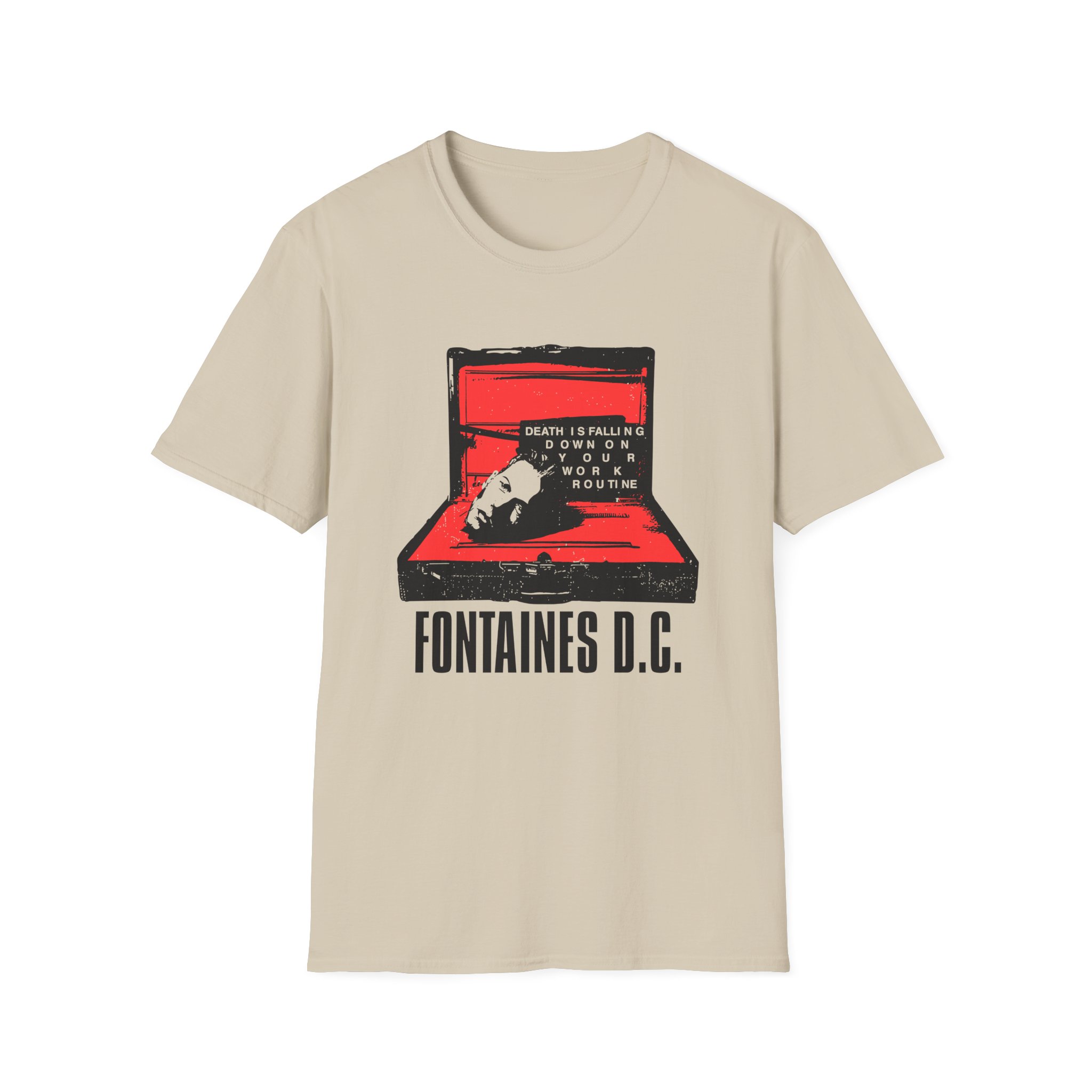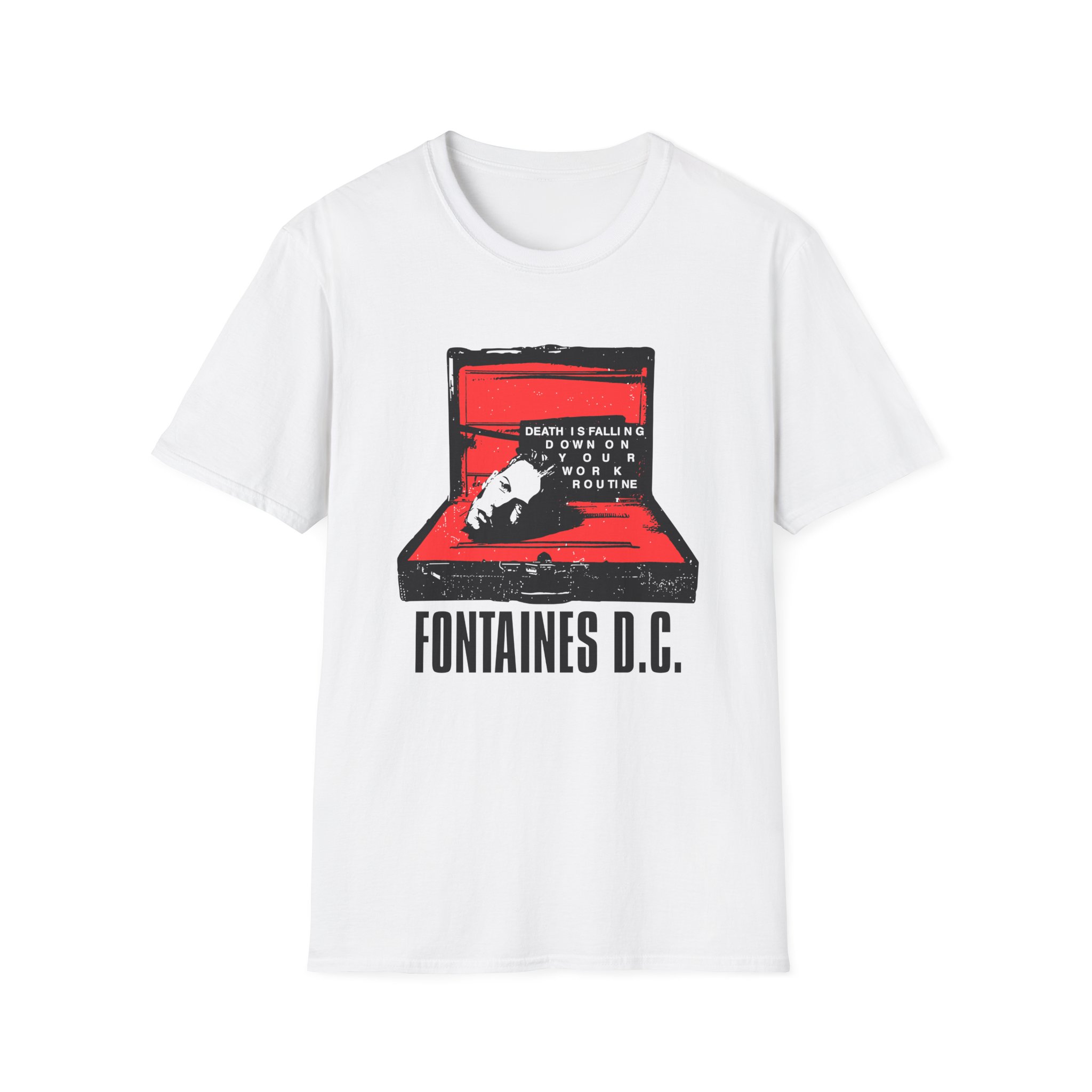 The Fontaines Death Is Falling Down On Your Work Routine unisex soft-style t-shirt puts a new spin on casual comfort. Made from very soft materials, this tee is 100% cotton for solid colors. Heather colors and sports grey include polyester. The shoulders have twill tape for improved durability. There are no side seams. The collar is made with ribbed knitting to prevent curling damage.