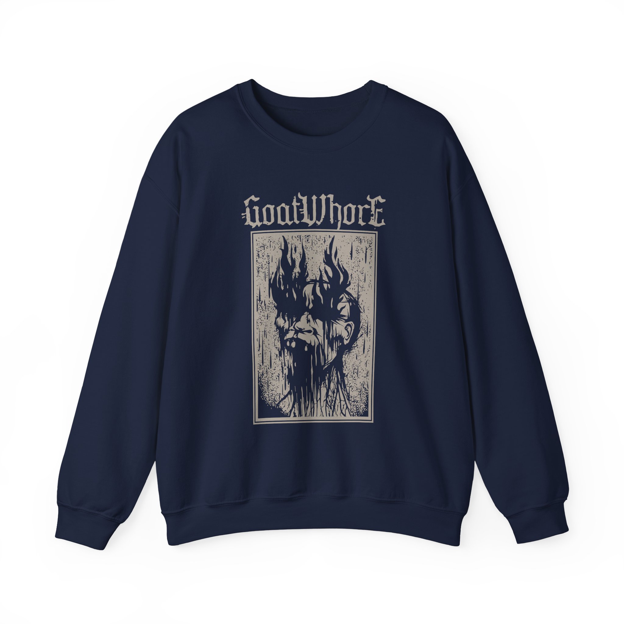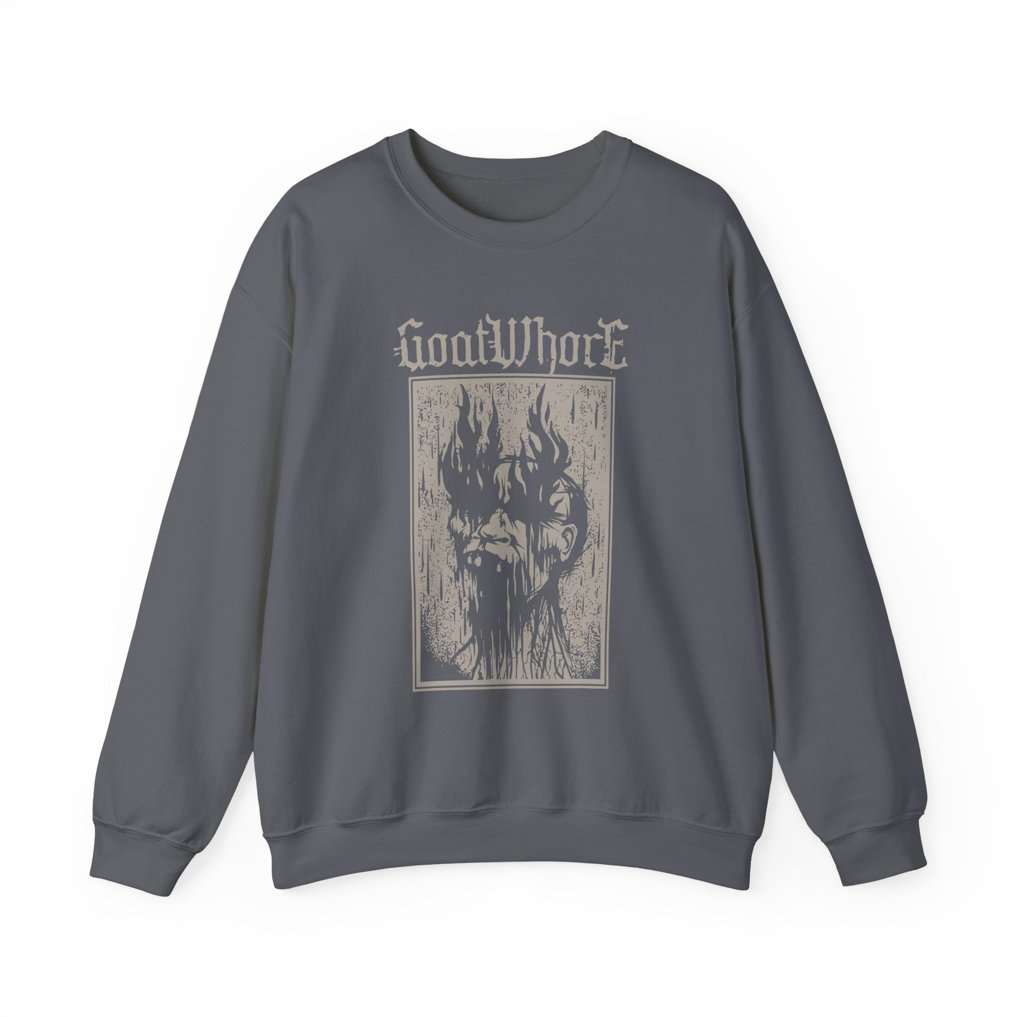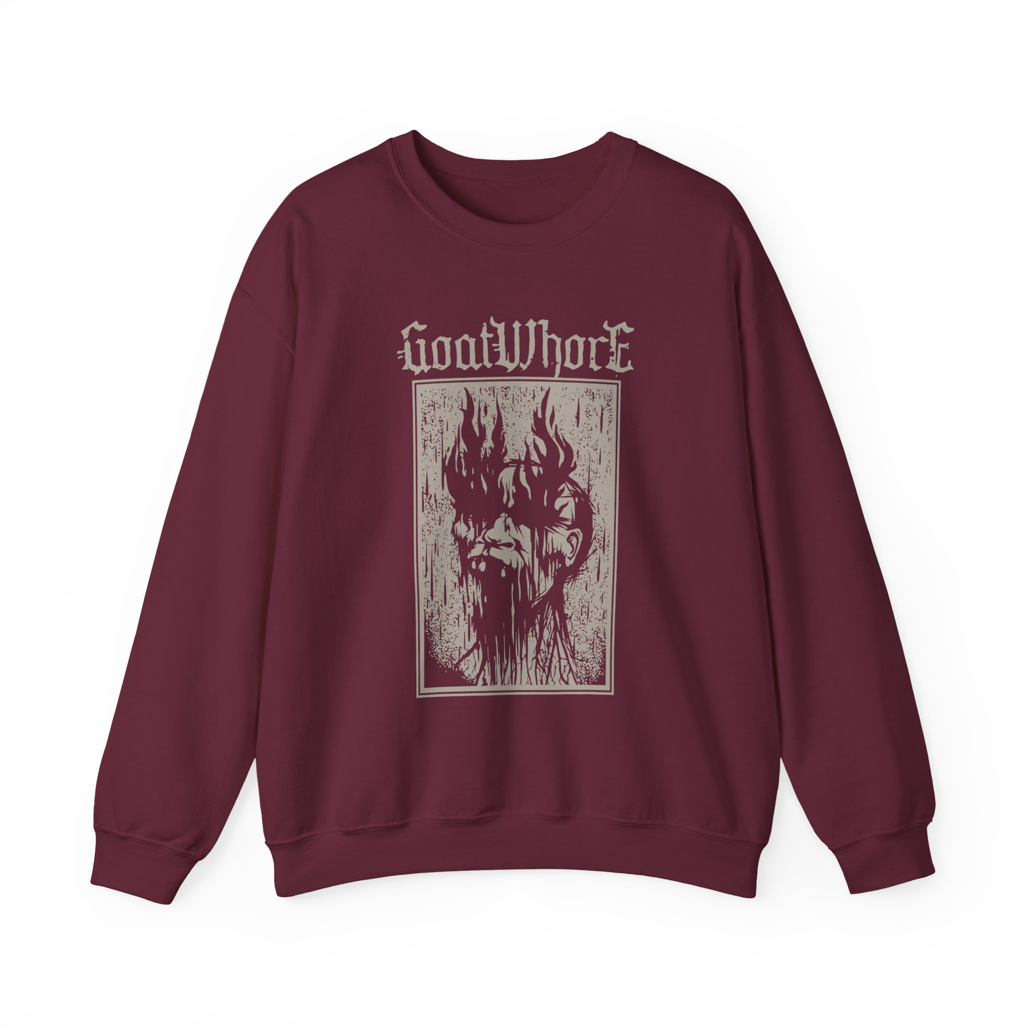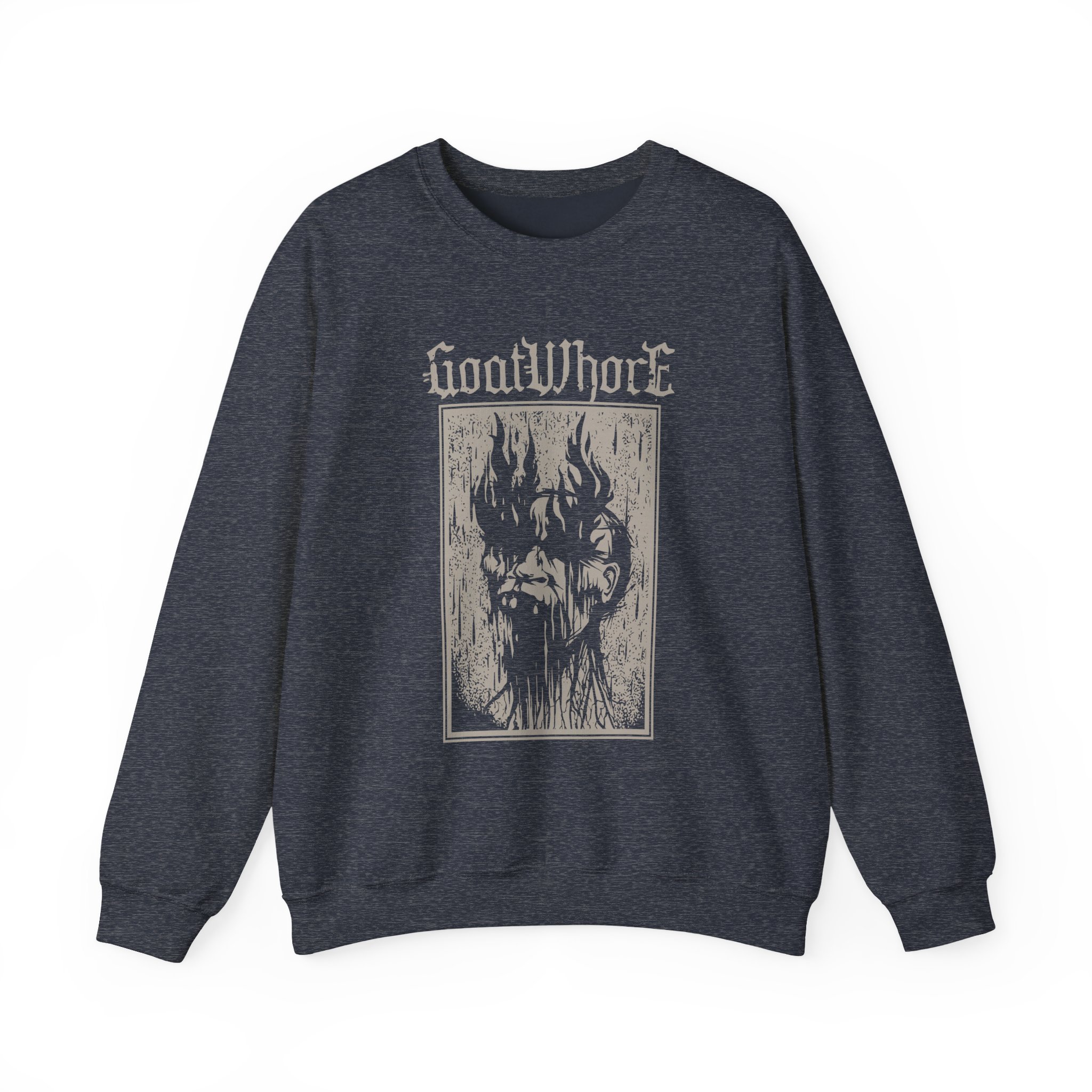 Ideal for any situation, a Goatwhore Q unisex heavy blend crewneck sweatshirt is pure comfort. These garments are made from polyester and cotton. This combination helps designs come out looking fresh and beautiful. The collar is ribbed knit, so it retains its shape even after washing. There are no itchy side seams on these sweaters.