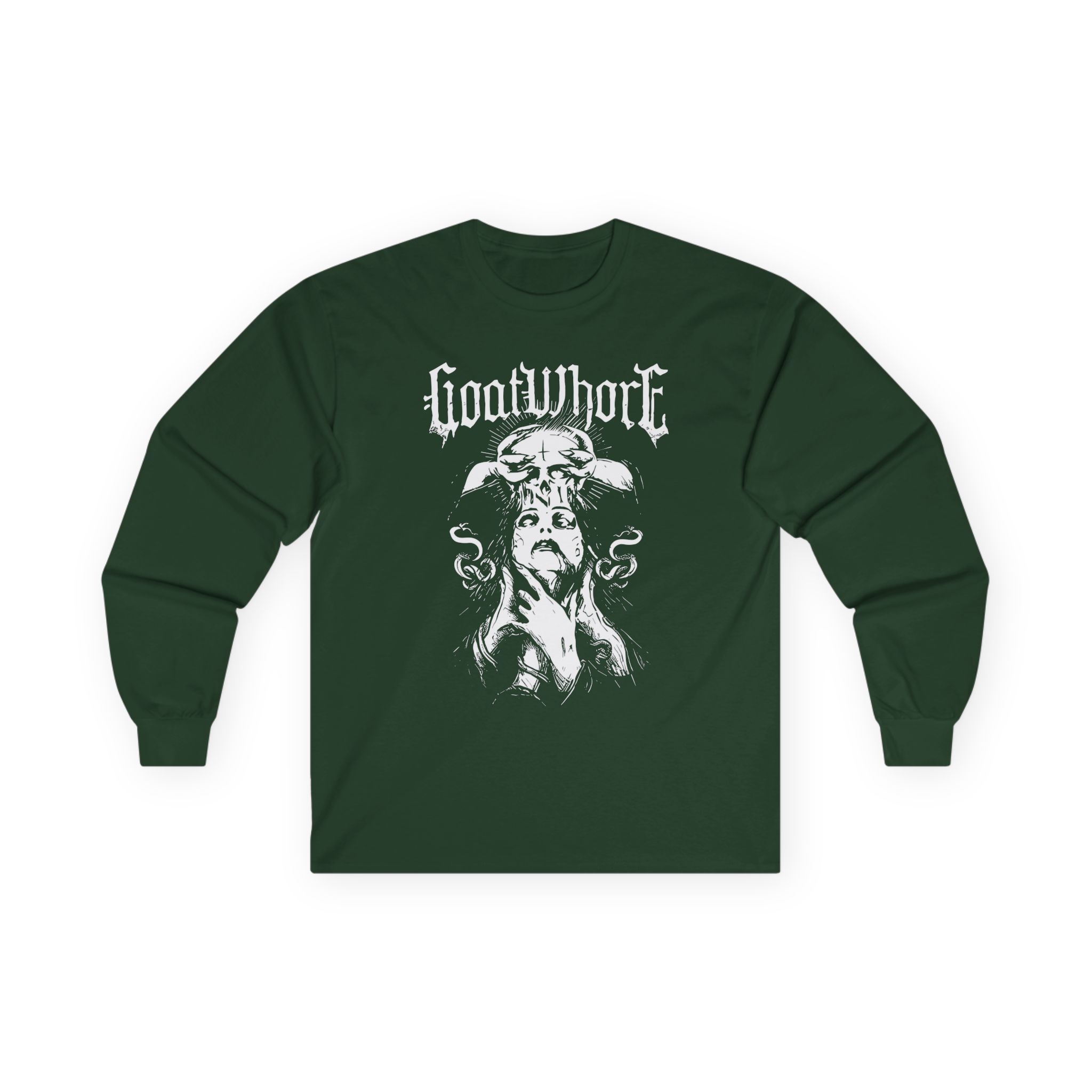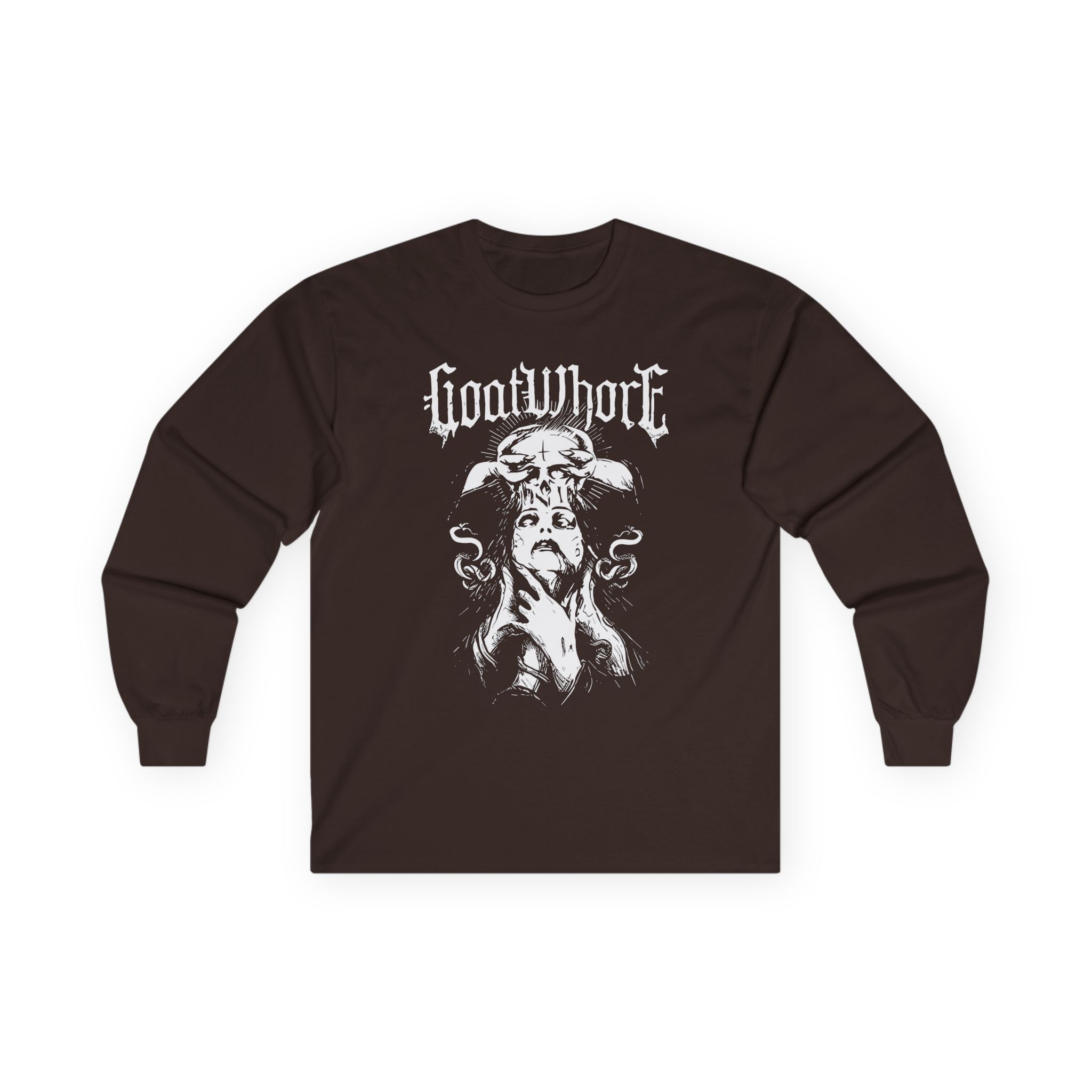 A bit more formal than a standard-issue t-shirt, the Goatwhore Satan’s Flesh ultra cotton long sleeve tee is a clear comfort winner. The sleeves also act as a nice frame. There are no side seams. The shoulders are taped for improved durability. This makes for a good fitting around the shoulders and neck. The cotton used for these shirts is environmentally friendly.