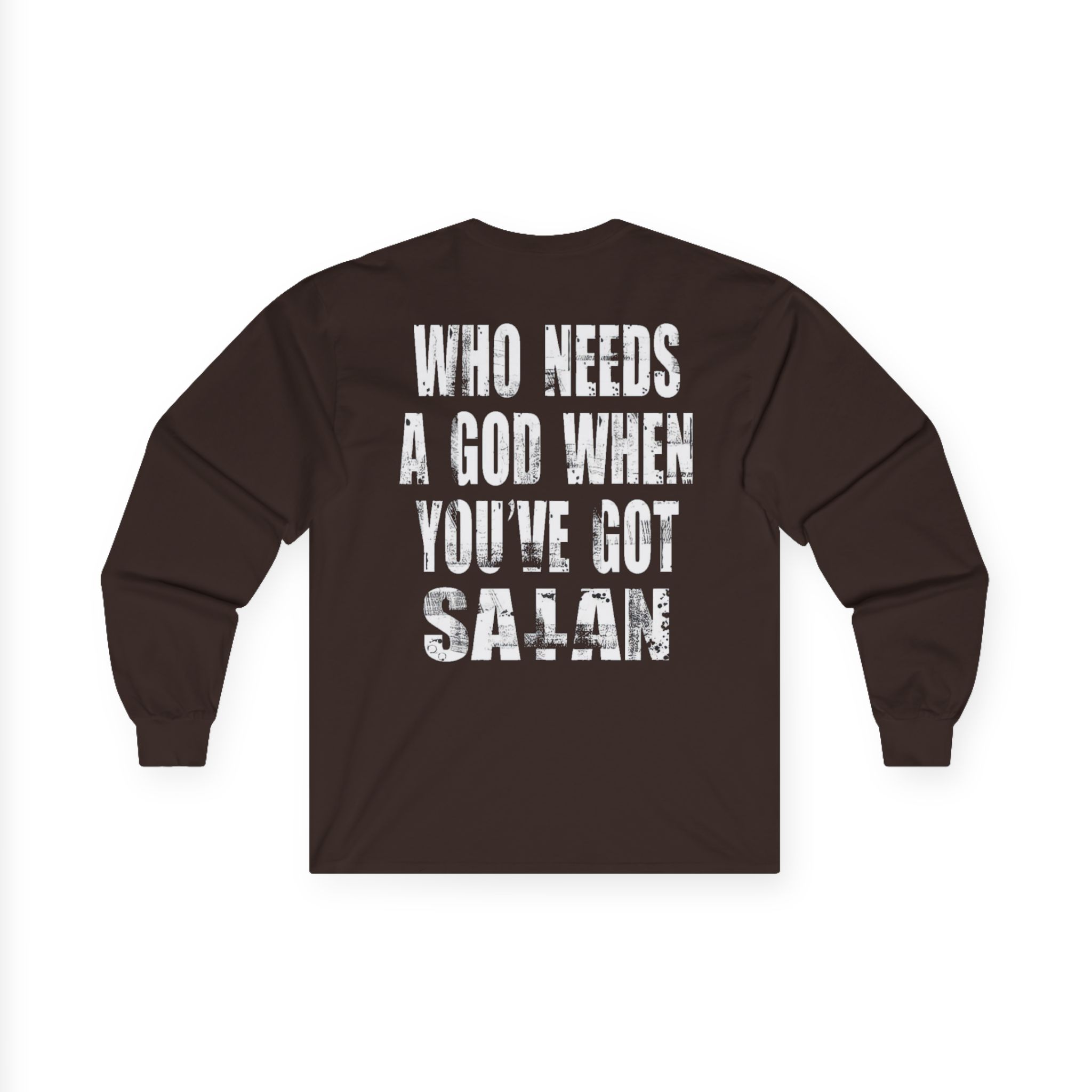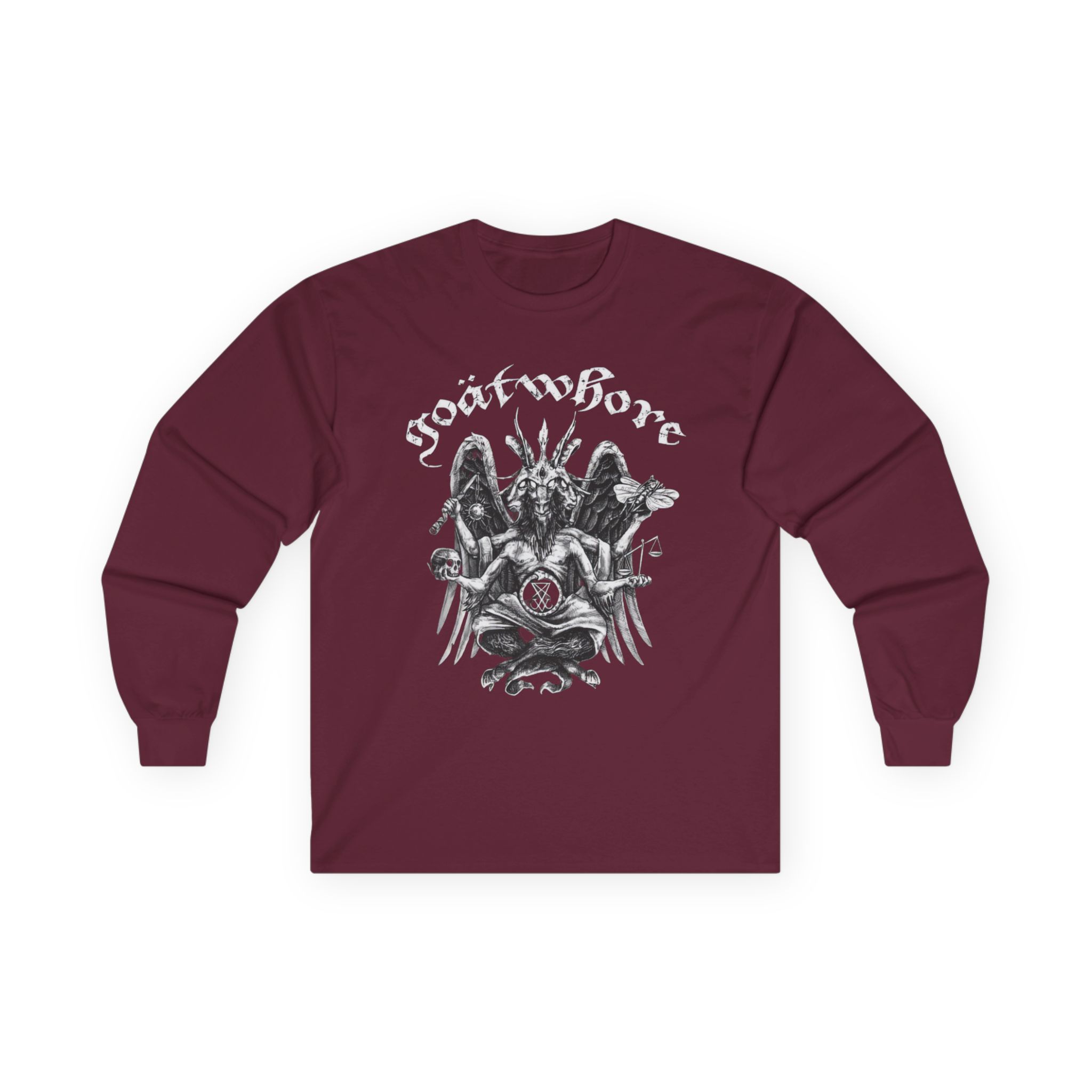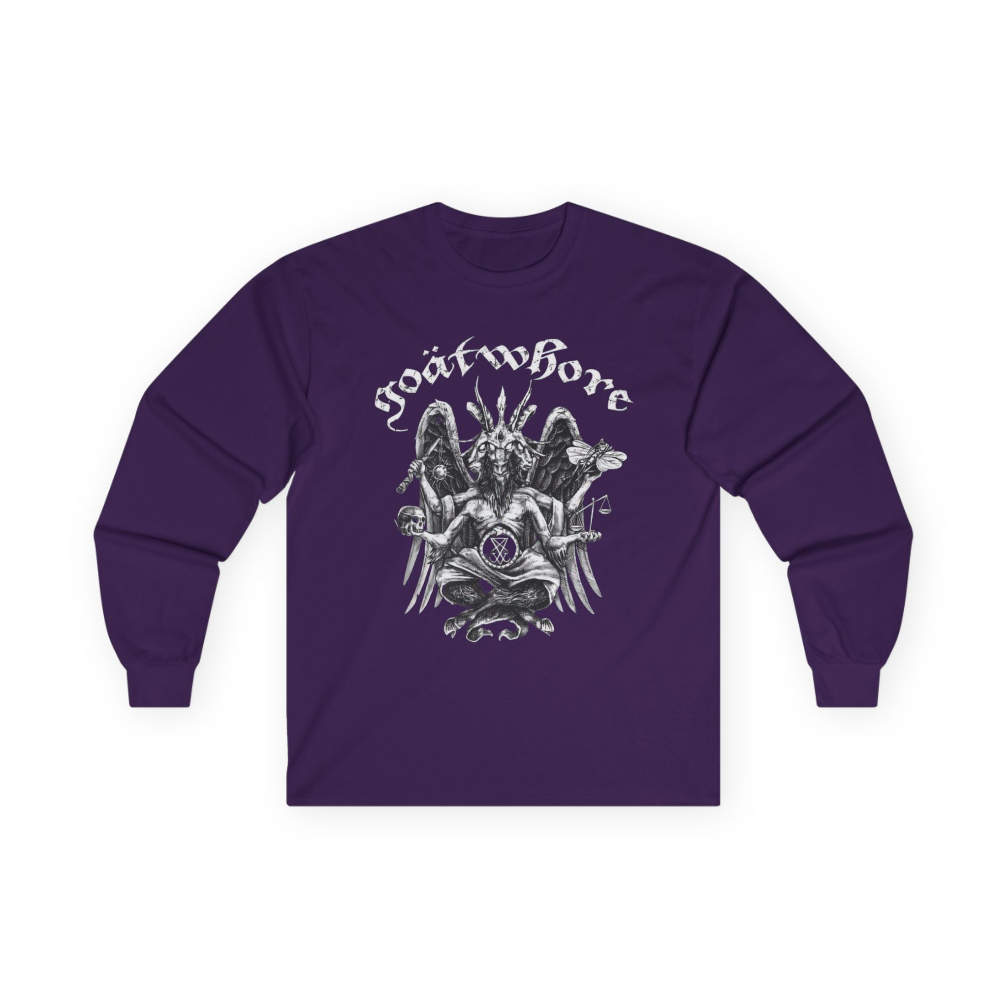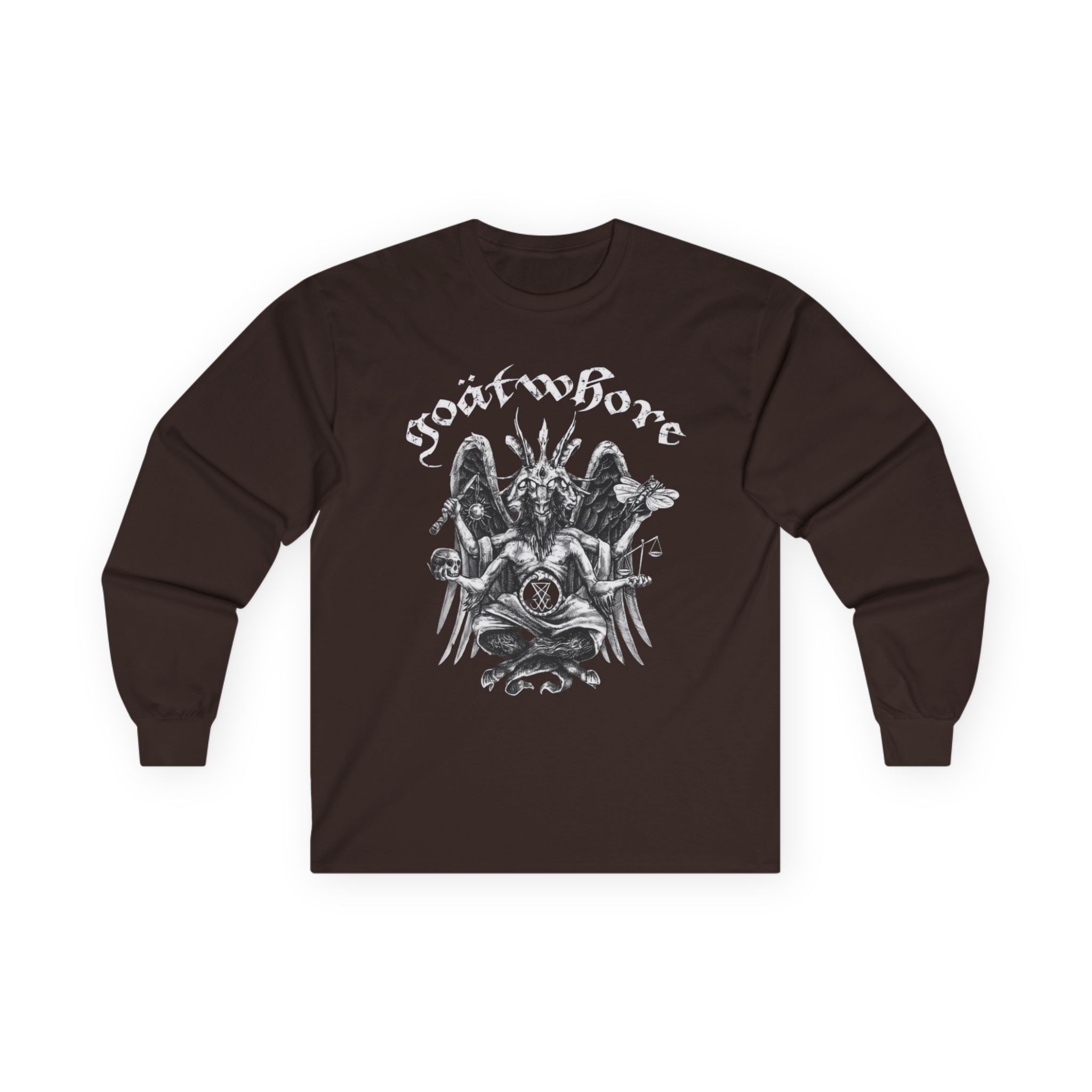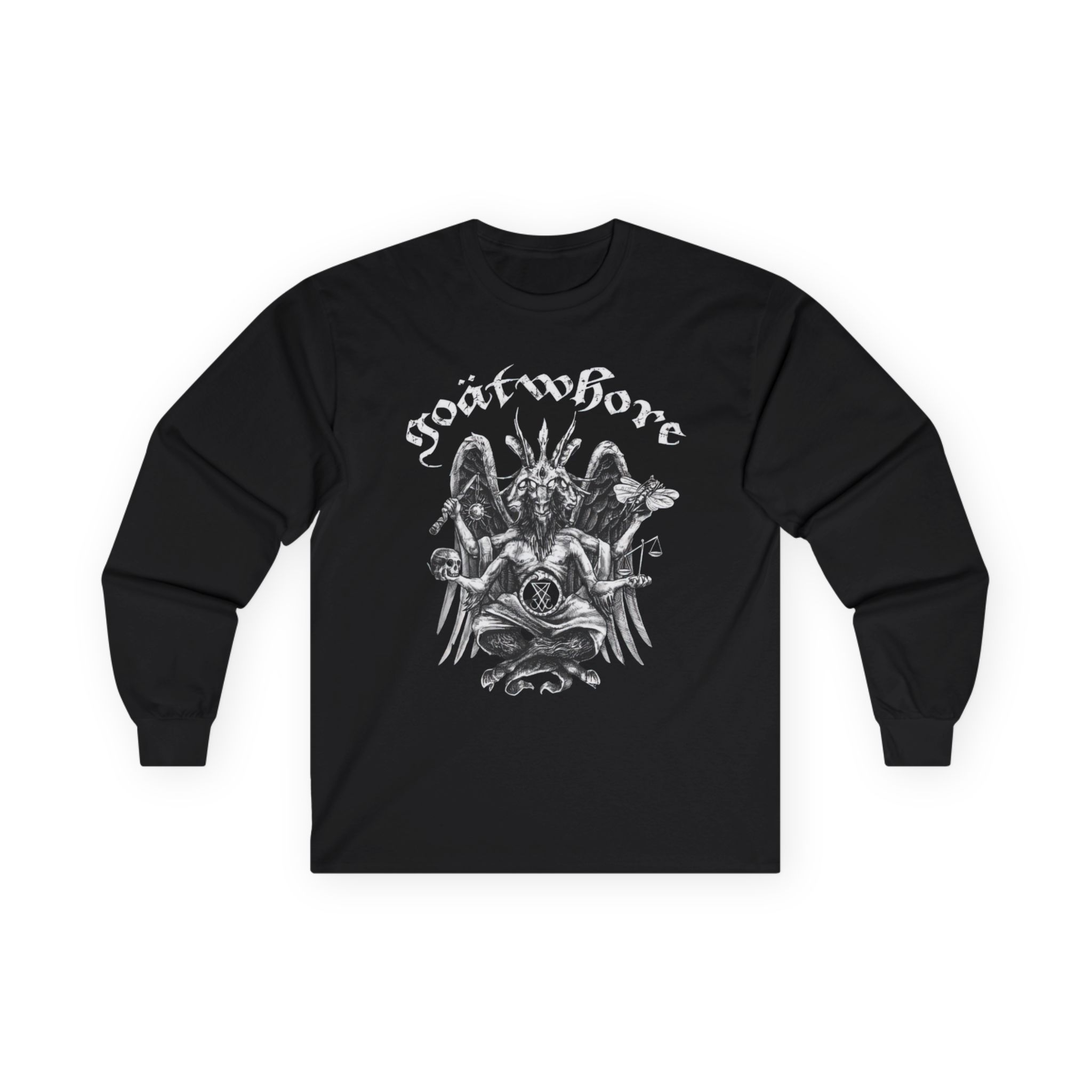 A bit more formal than a standard-issue t-shirt, the Goatwhore who Needs a God When You’ve Got Satan ultra cotton long sleeve tee is a clear comfort winner. The sleeves also act as a nice frame. There are no side seams. The shoulders are taped for improved durability. This makes for a good fitting around the shoulders and neck. The cotton used for these shirts is environmentally friendly.