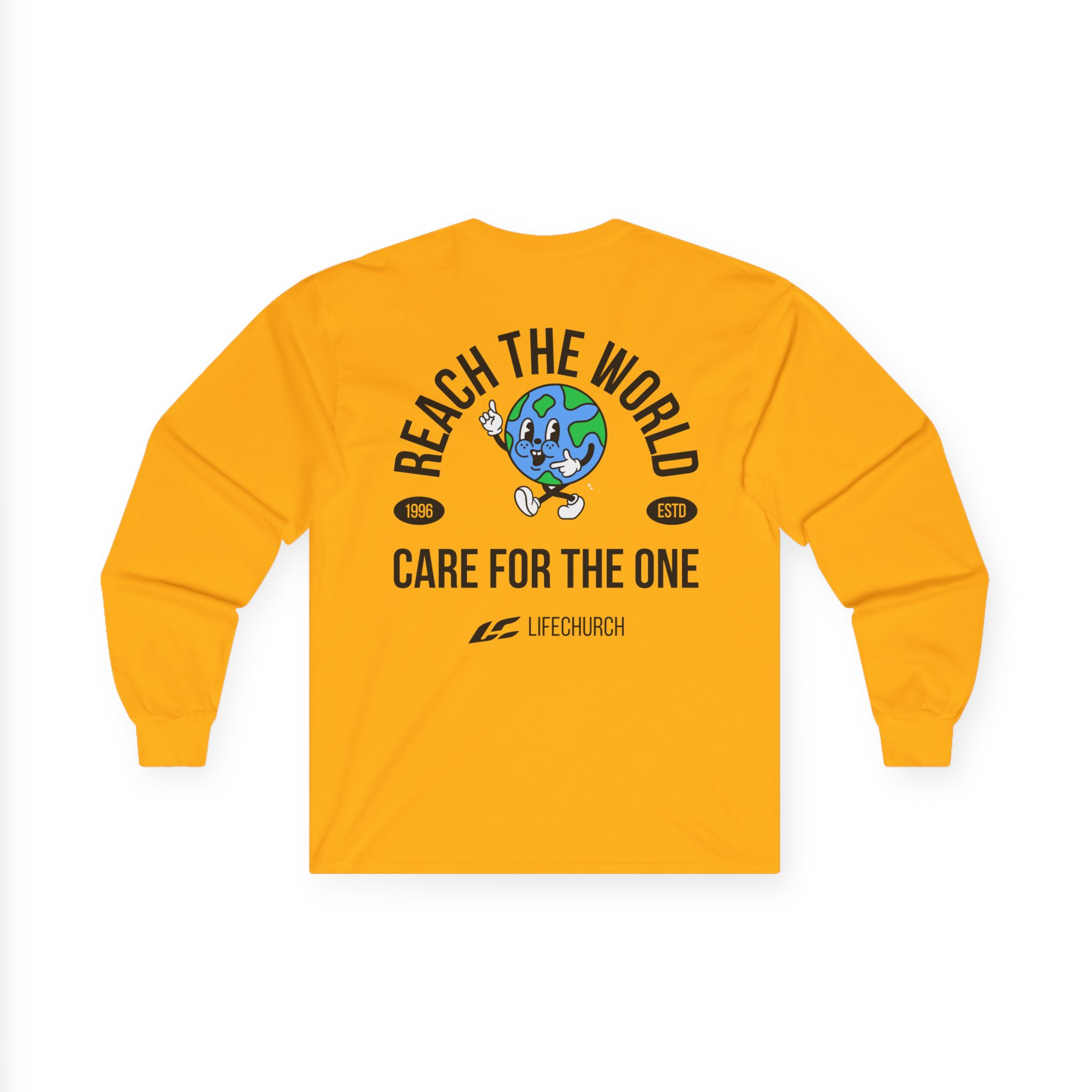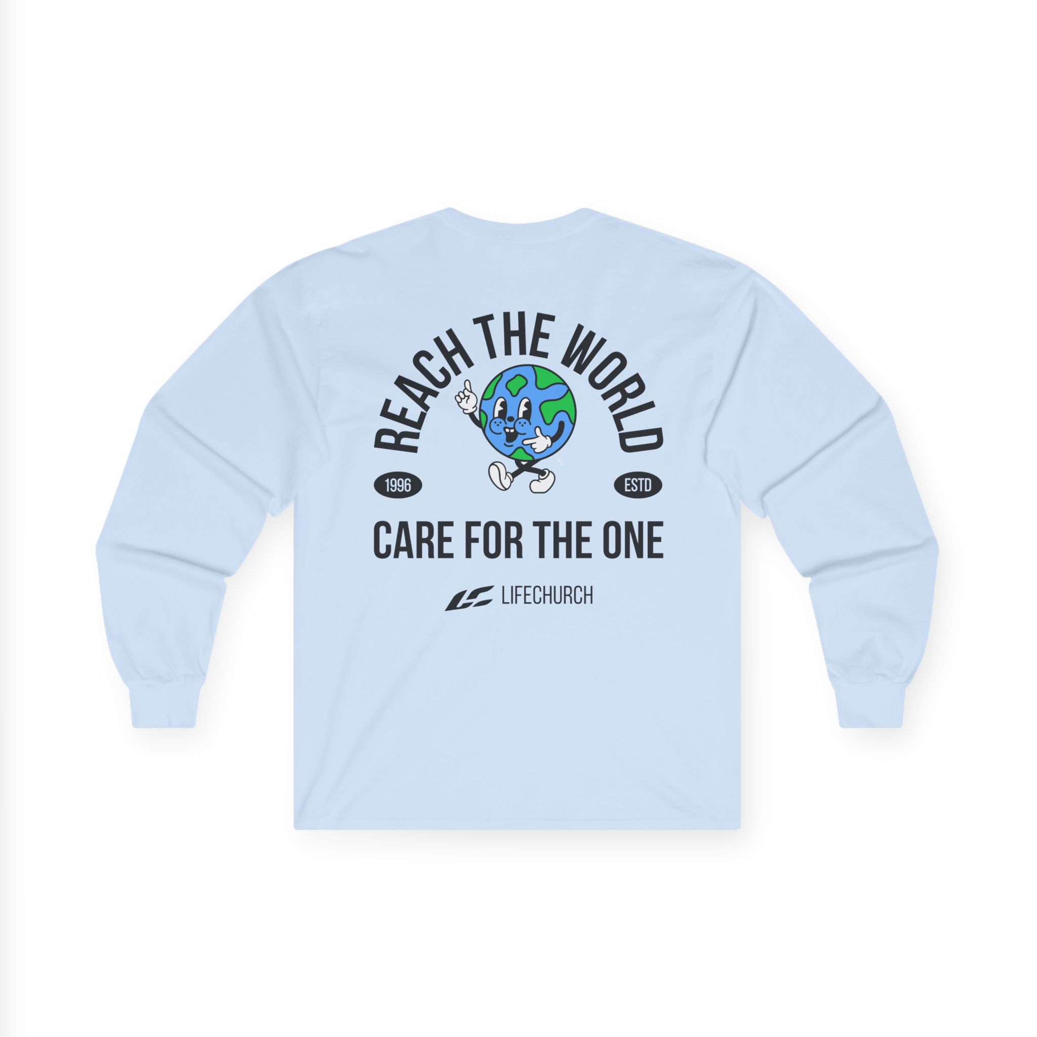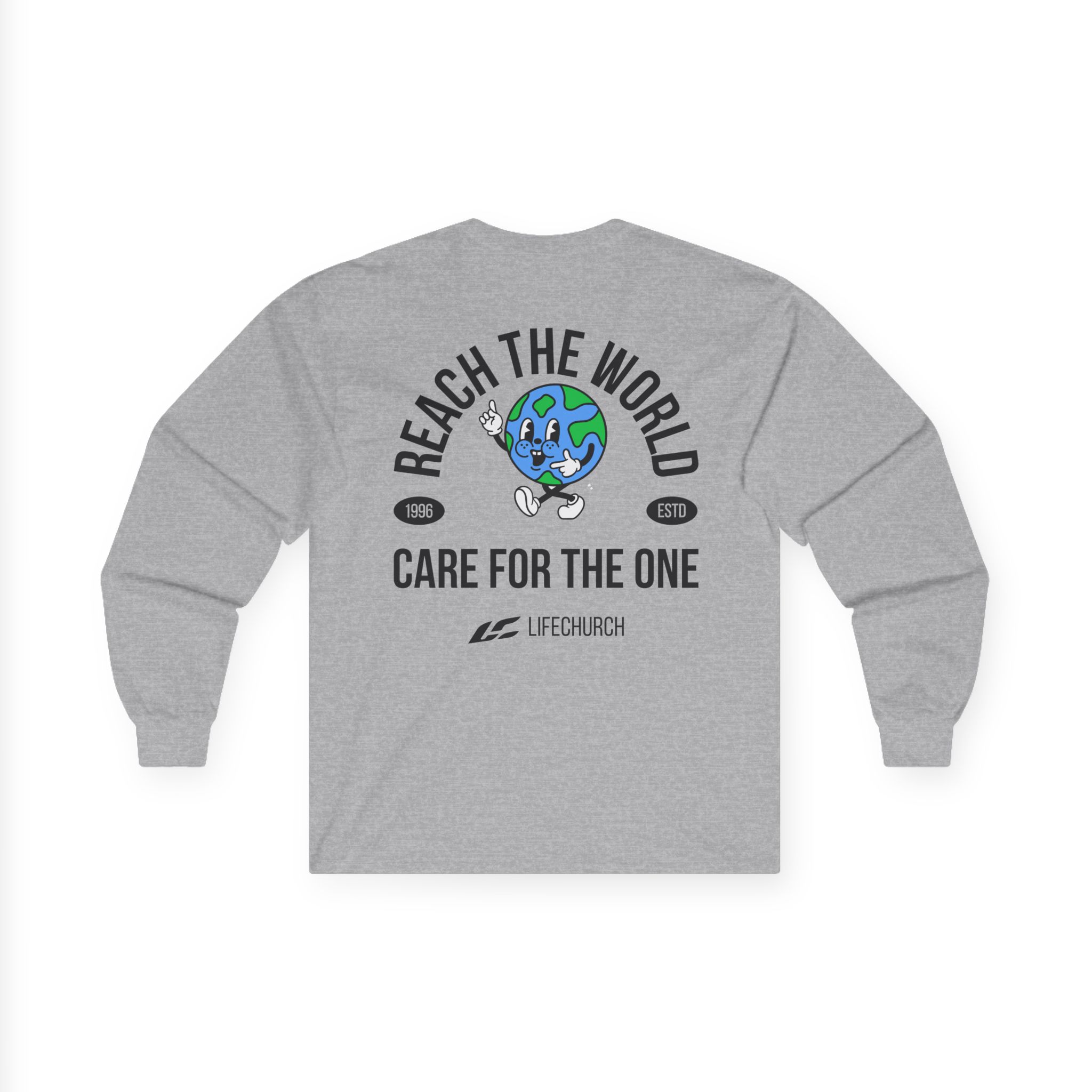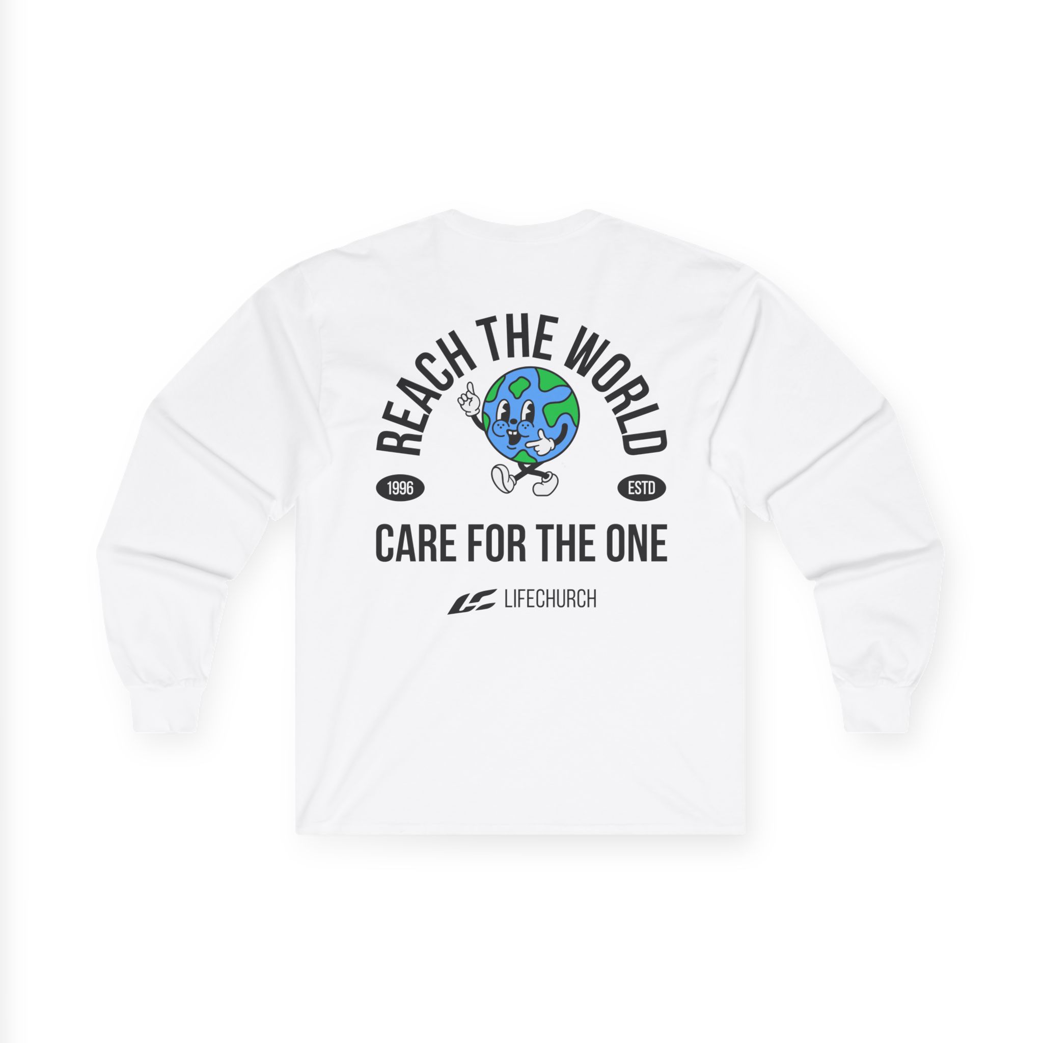 A bit more formal than a standard-issue t-shirt, the Life Church Reach the World Care for the One ultra cotton long sleeve tee is a clear comfort winner. The sleeves also act as a nice frame. There are no side seams. The shoulders are taped for improved durability. This makes for a good fitting around the shoulders and neck. The cotton used for these shirts is environmentally friendly.