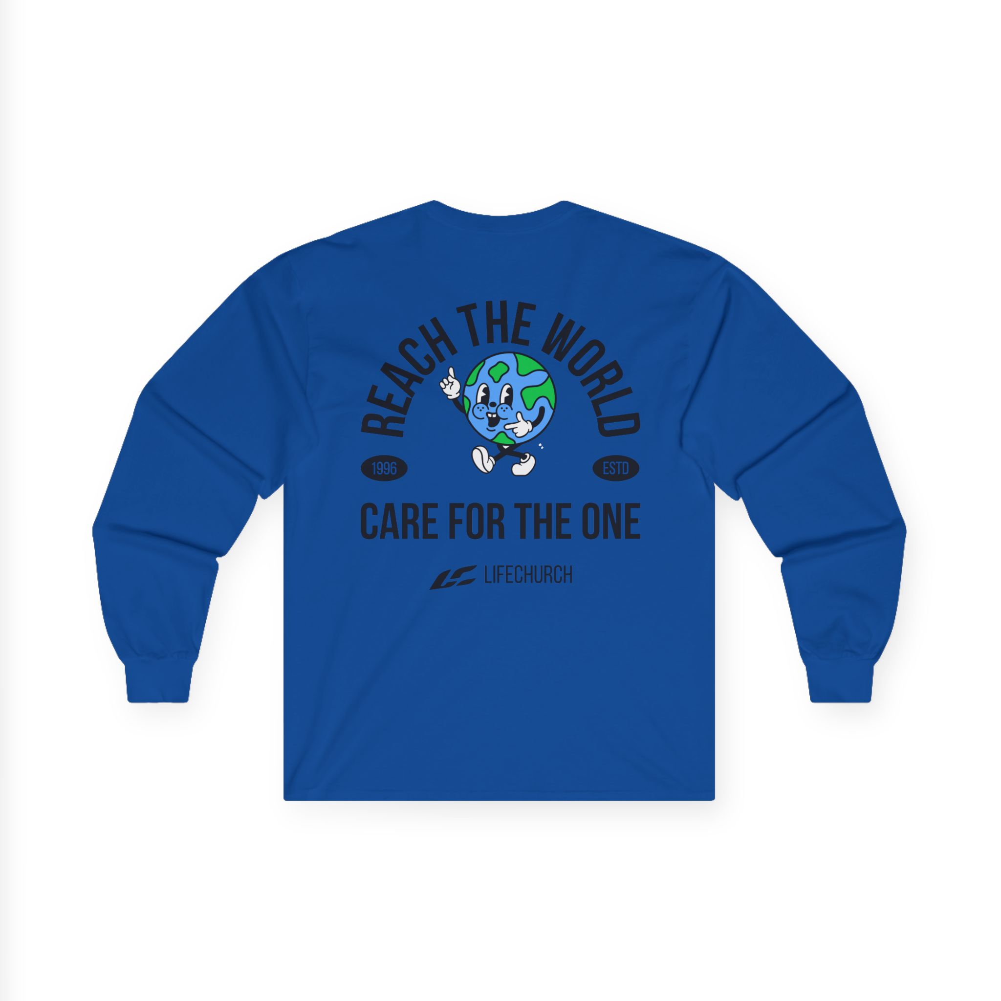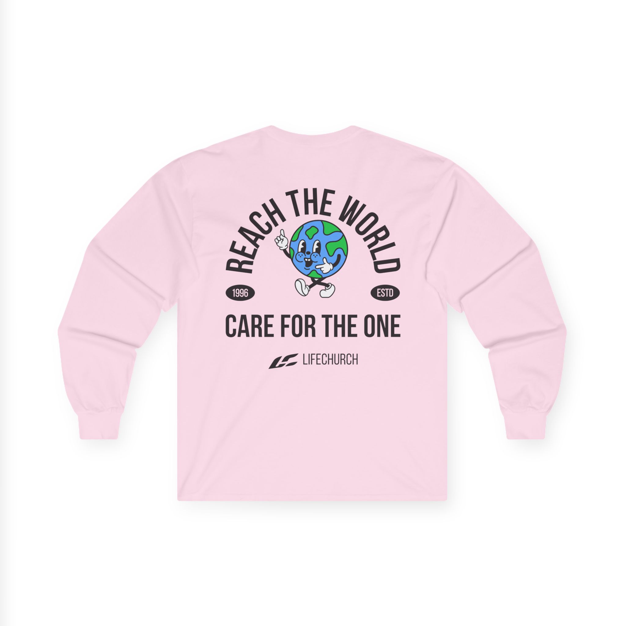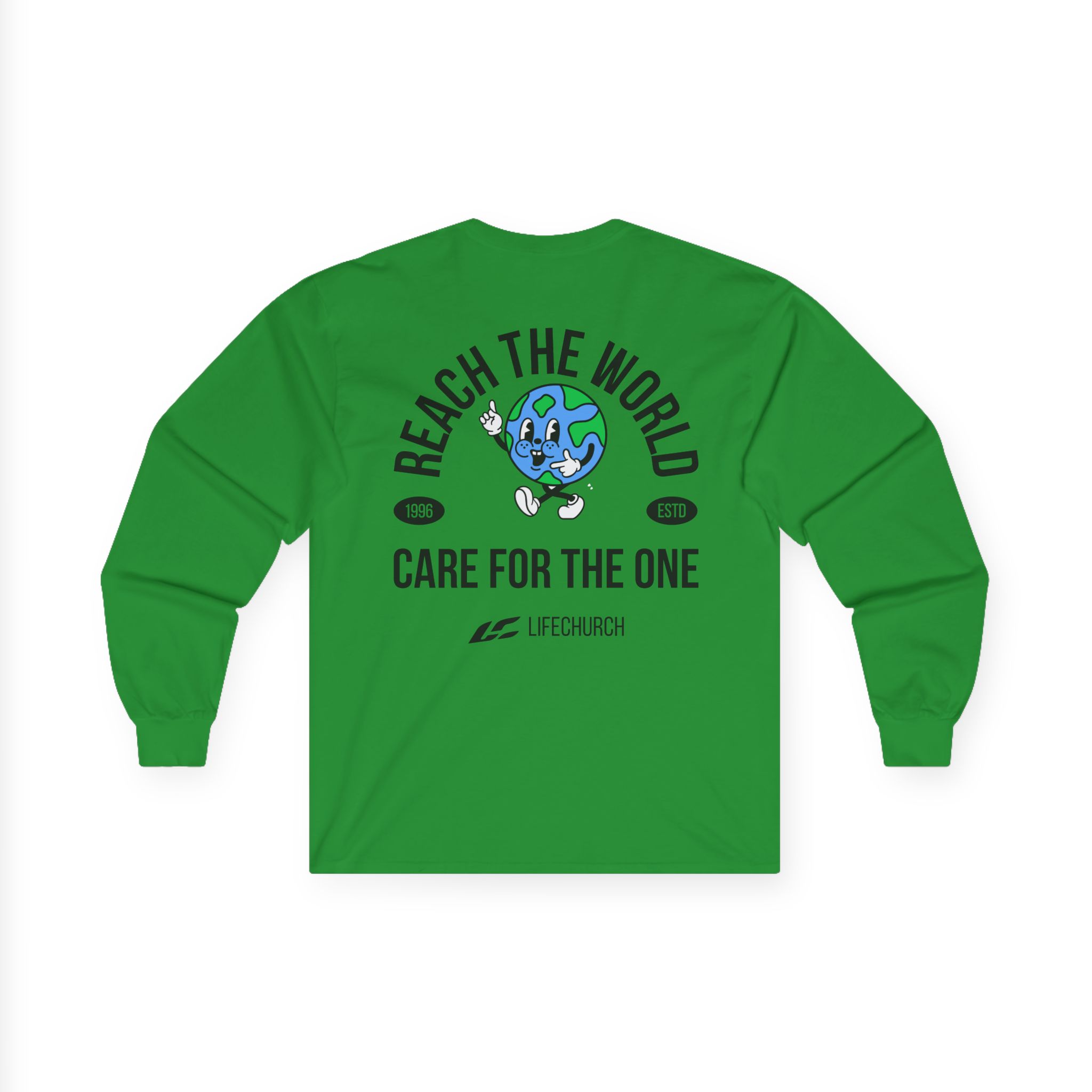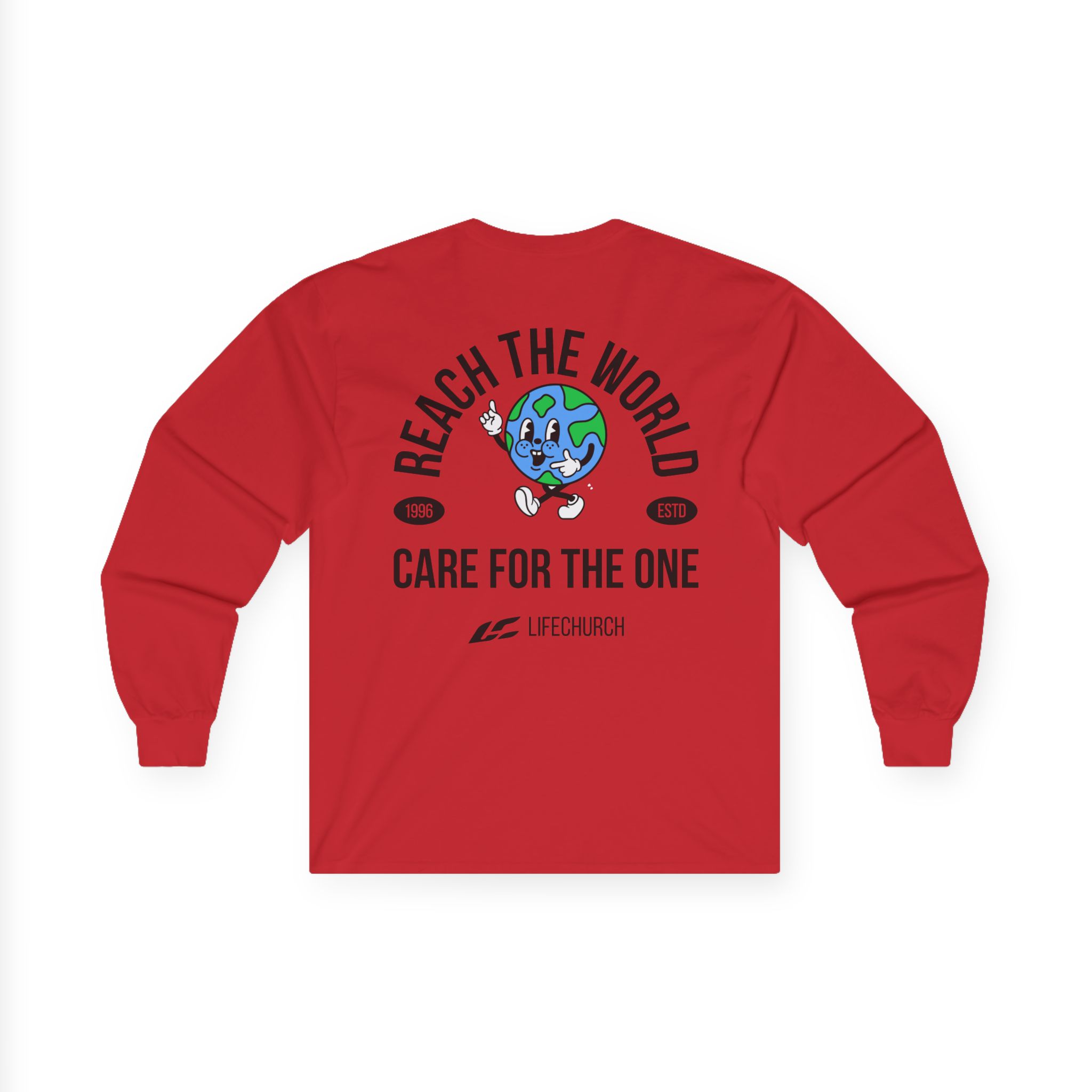A bit more formal than a standard-issue t-shirt, the Life Church Reach the World Care for the One ultra cotton long sleeve tee is a clear comfort winner. The sleeves also act as a nice frame. There are no side seams. The shoulders are taped for improved durability. This makes for a good fitting around the shoulders and neck. The cotton used for these shirts is environmentally friendly.