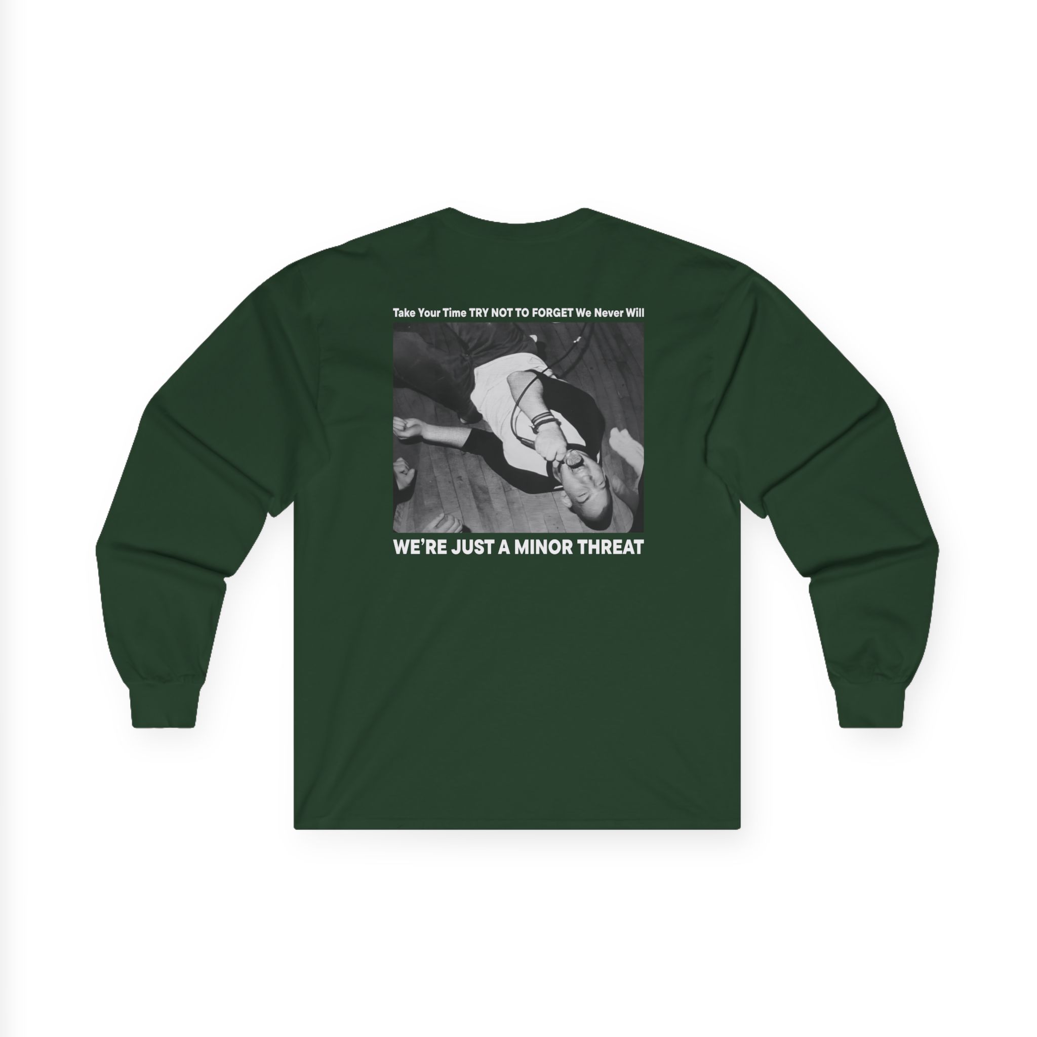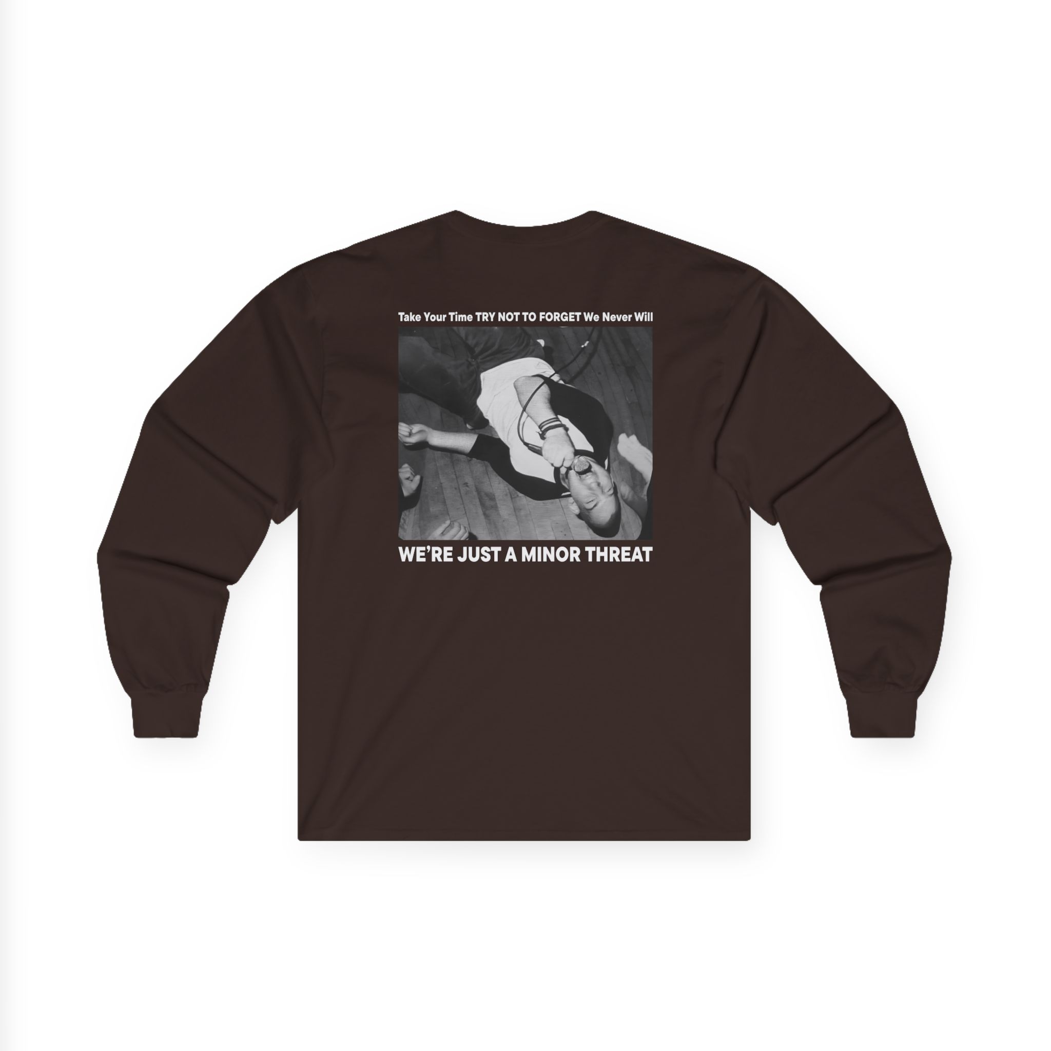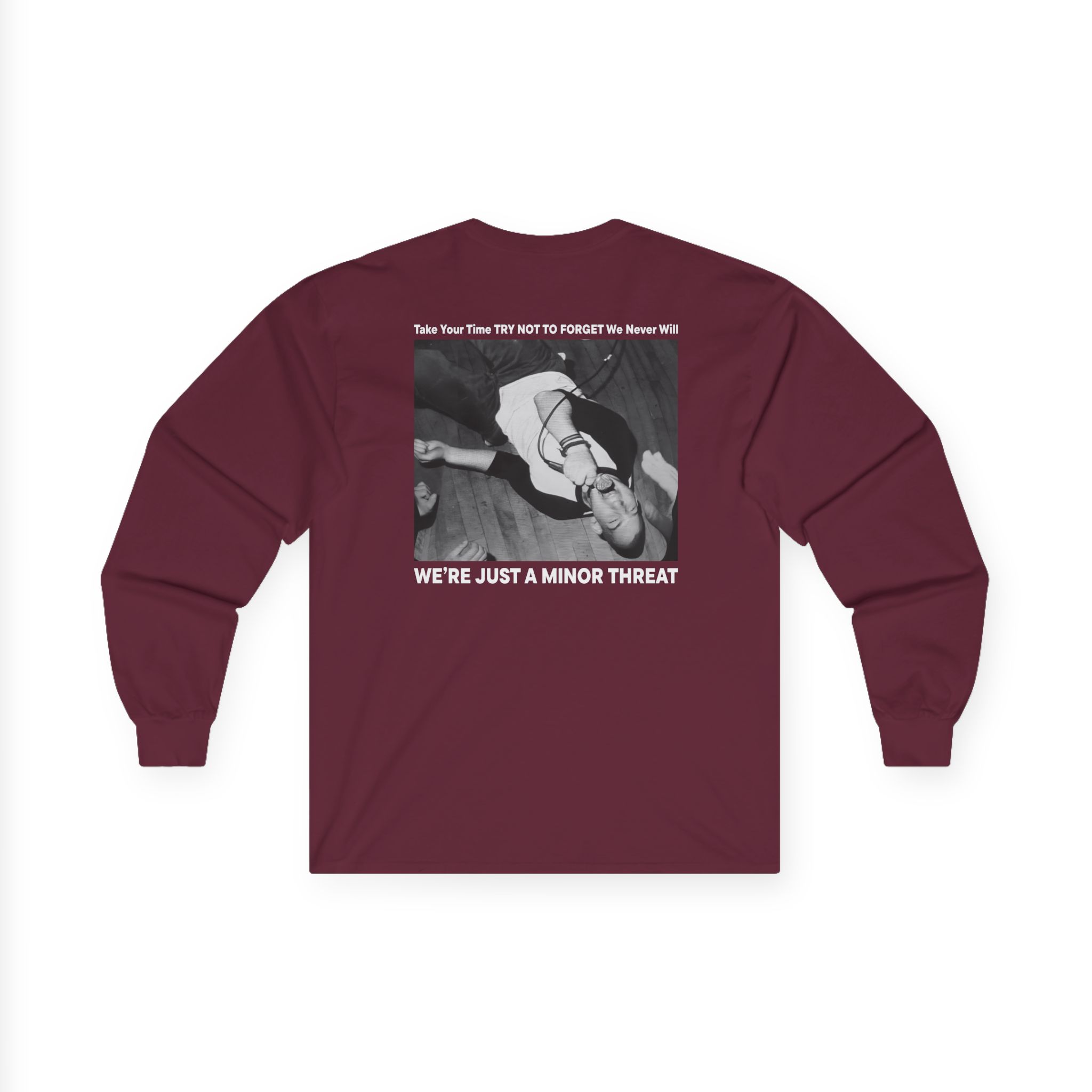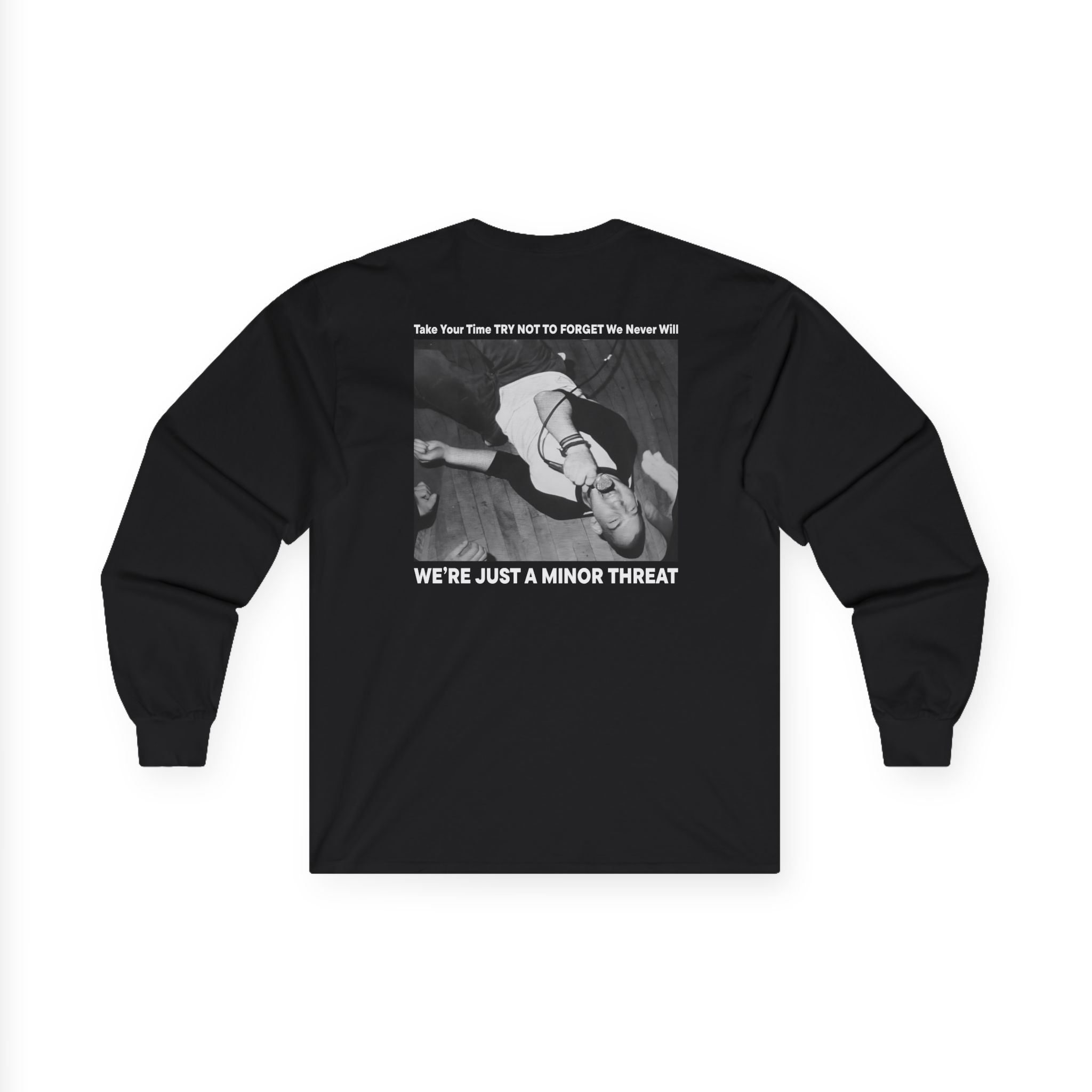 A bit more formal than a standard-issue t-shirt, the Minor Threat Just a ultra cotton long sleeve tee is a clear comfort winner. The sleeves also act as a nice frame. There are no side seams. The shoulders are taped for improved durability. This makes for a good fitting around the shoulders and neck. The cotton used for these shirts is environmentally friendly.