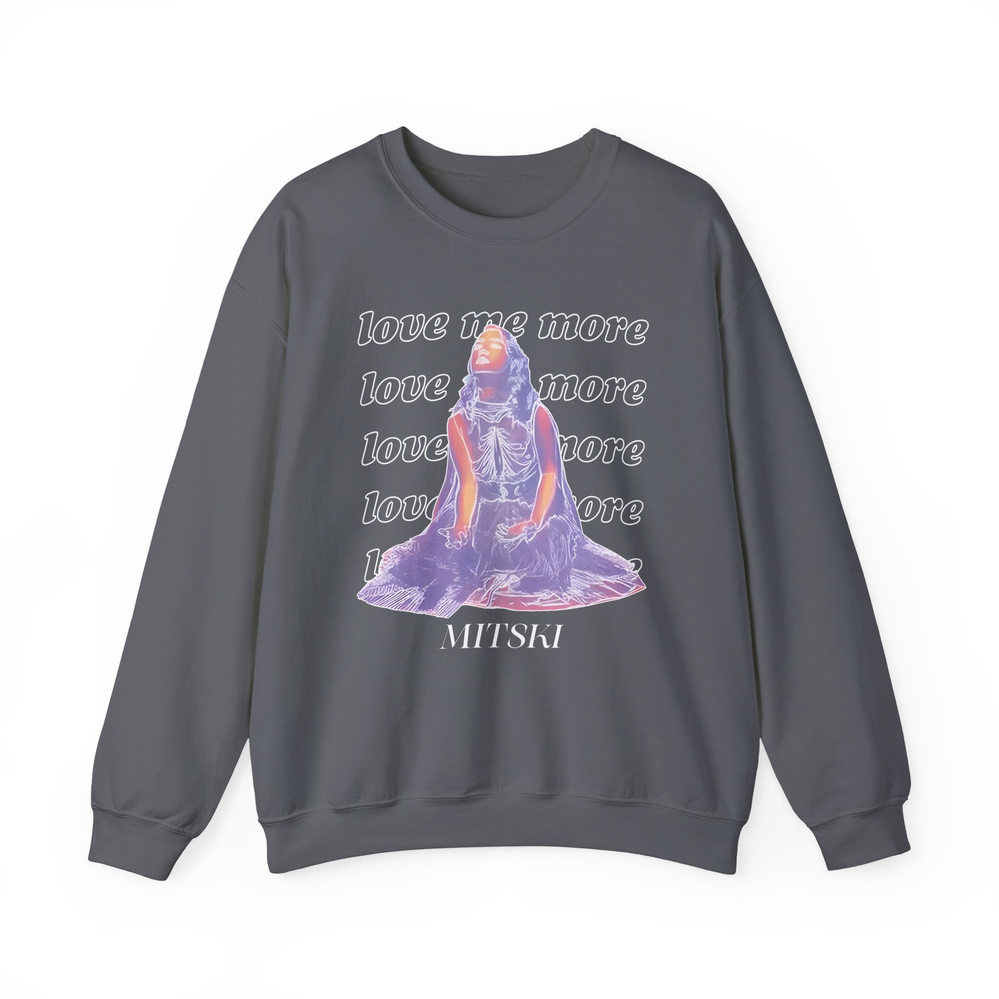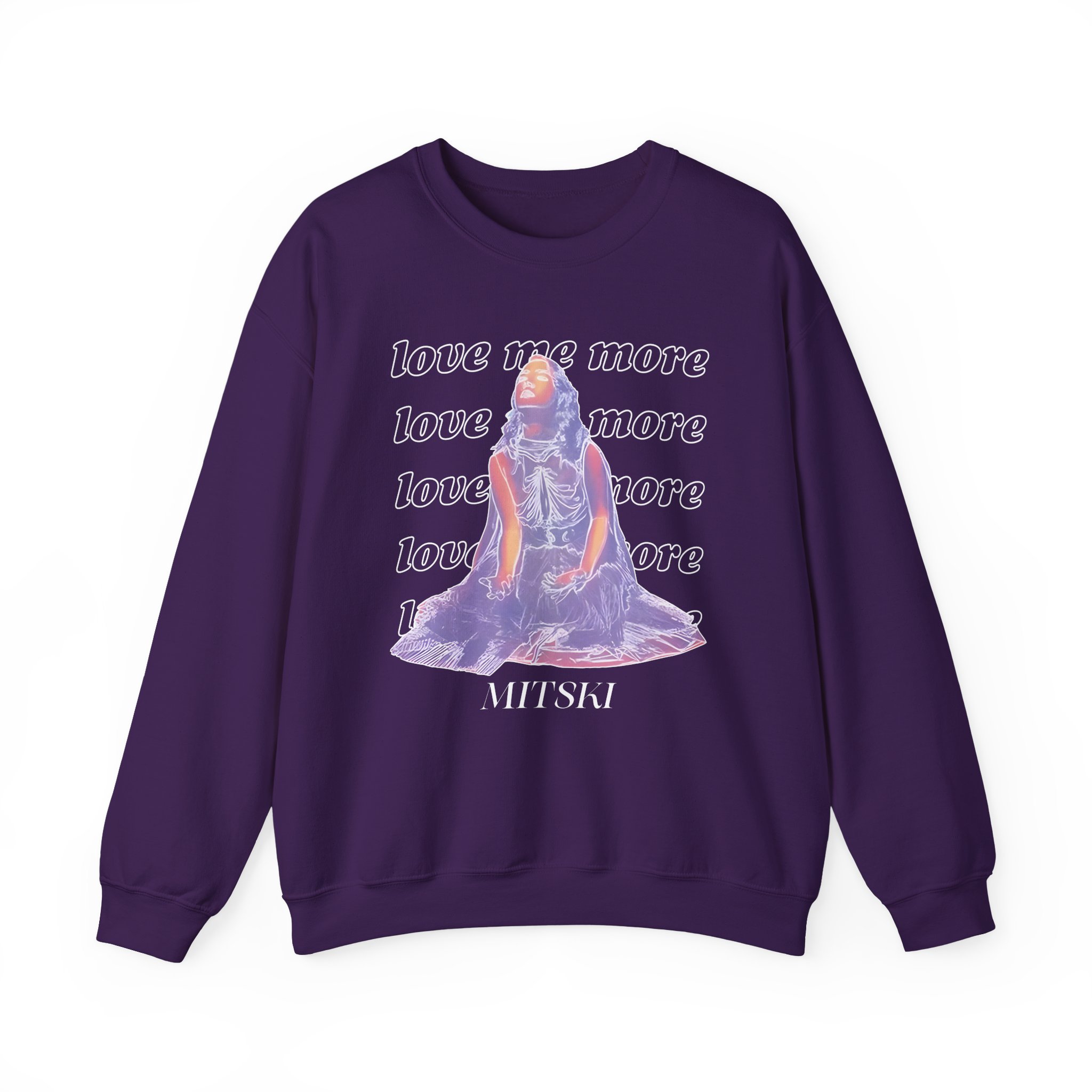 Ideal for any situation, a Mitski Love Me More unisex heavy blend crewneck sweatshirt is pure comfort. These garments are made from polyester and cotton. This combination helps designs come out looking fresh and beautiful. The collar is ribbed knit, so it retains its shape even after washing. There are no itchy side seams on these sweaters.