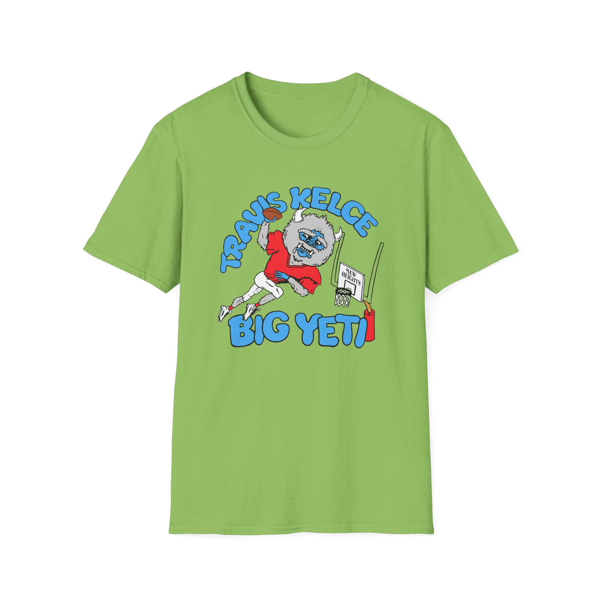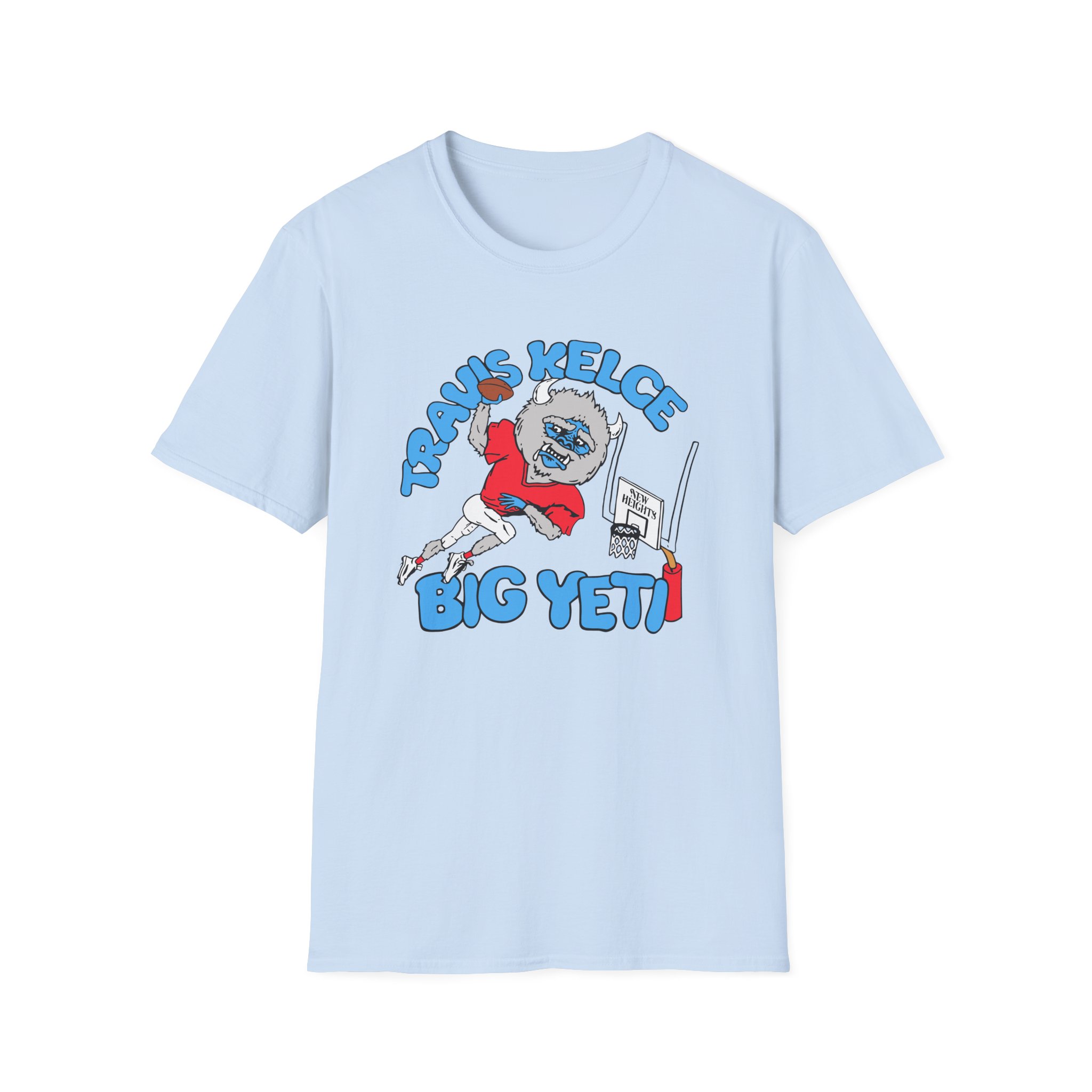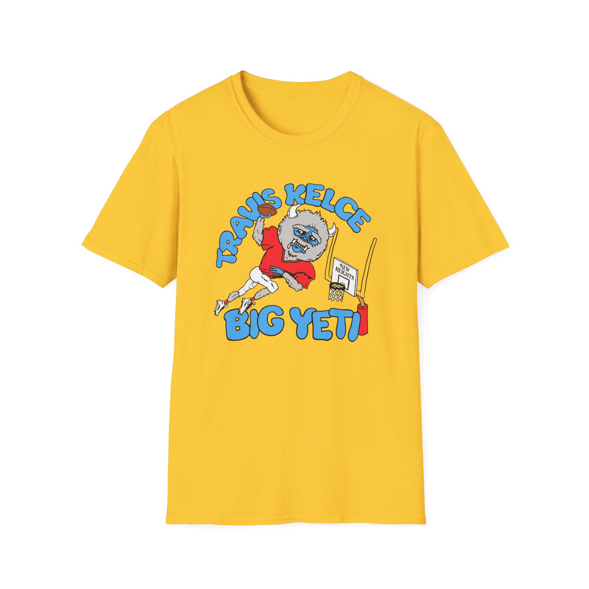 The New Heights Travis Kelce Big Yeti unisex soft-style t-shirt puts a new spin on casual comfort. Made from very soft materials, this tee is 100% cotton for solid colors. Heather colors and sports grey include polyester. The shoulders have twill tape for improved durability. There are no side seams. The collar is made with ribbed knitting to prevent curling damage.