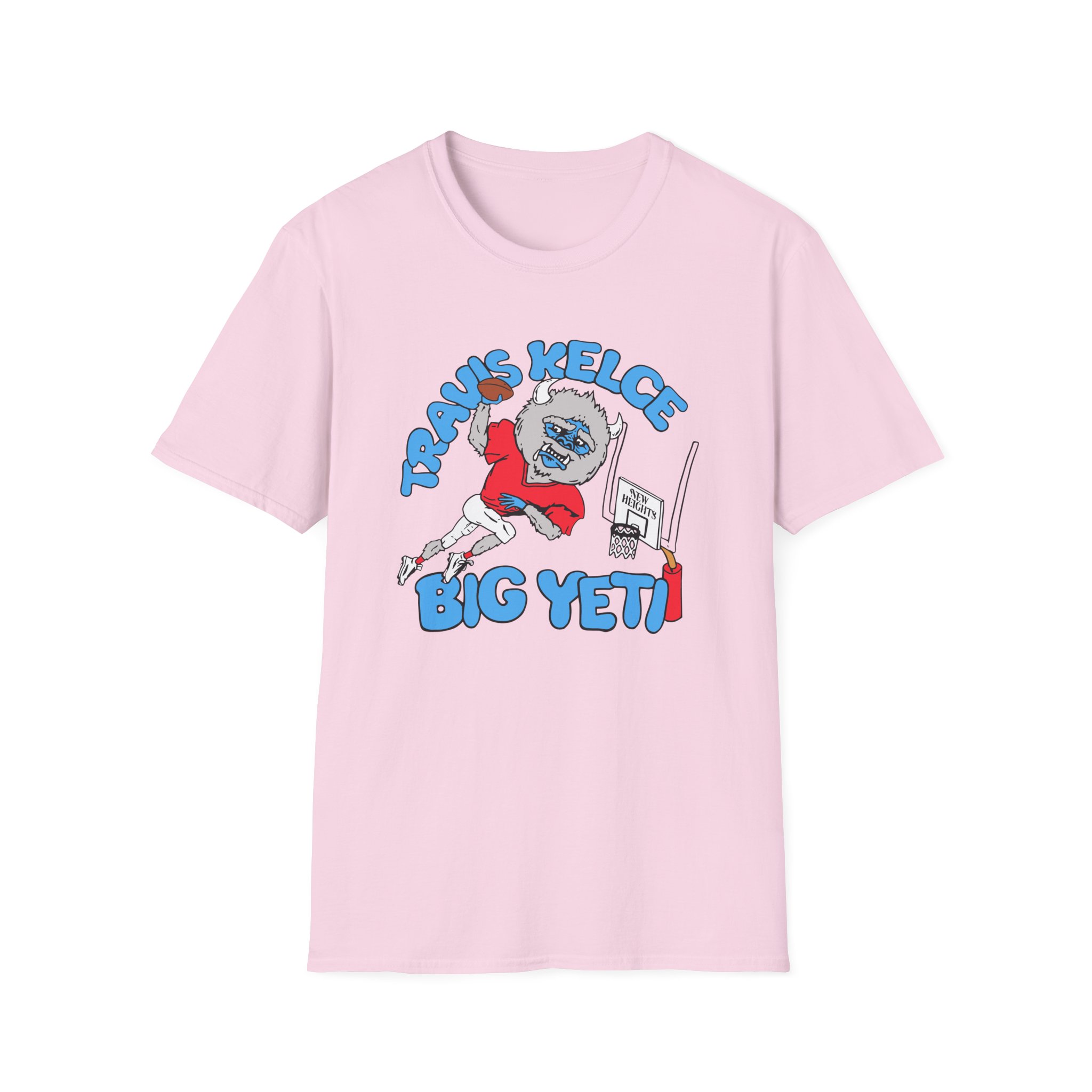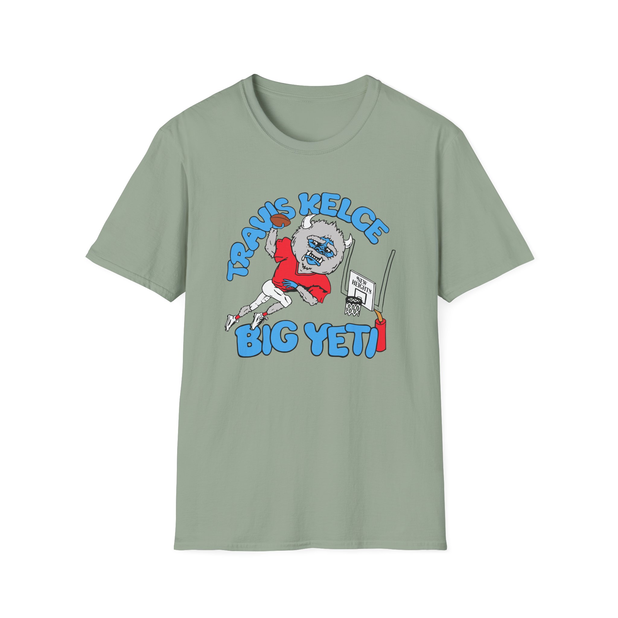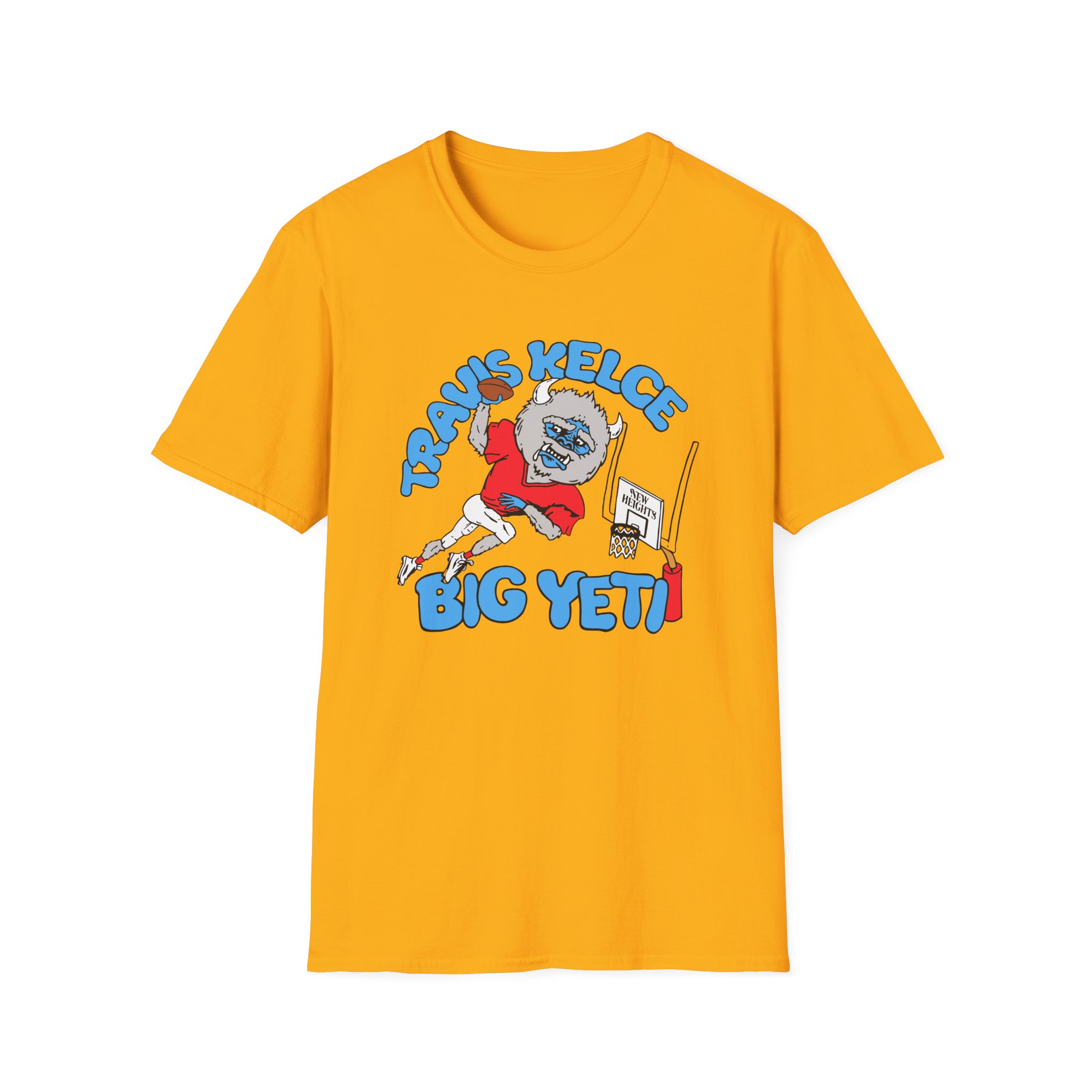 The New Heights Travis Kelce Big Yeti unisex soft-style t-shirt puts a new spin on casual comfort. Made from very soft materials, this tee is 100% cotton for solid colors. Heather colors and sports grey include polyester. The shoulders have twill tape for improved durability. There are no side seams. The collar is made with ribbed knitting to prevent curling damage.