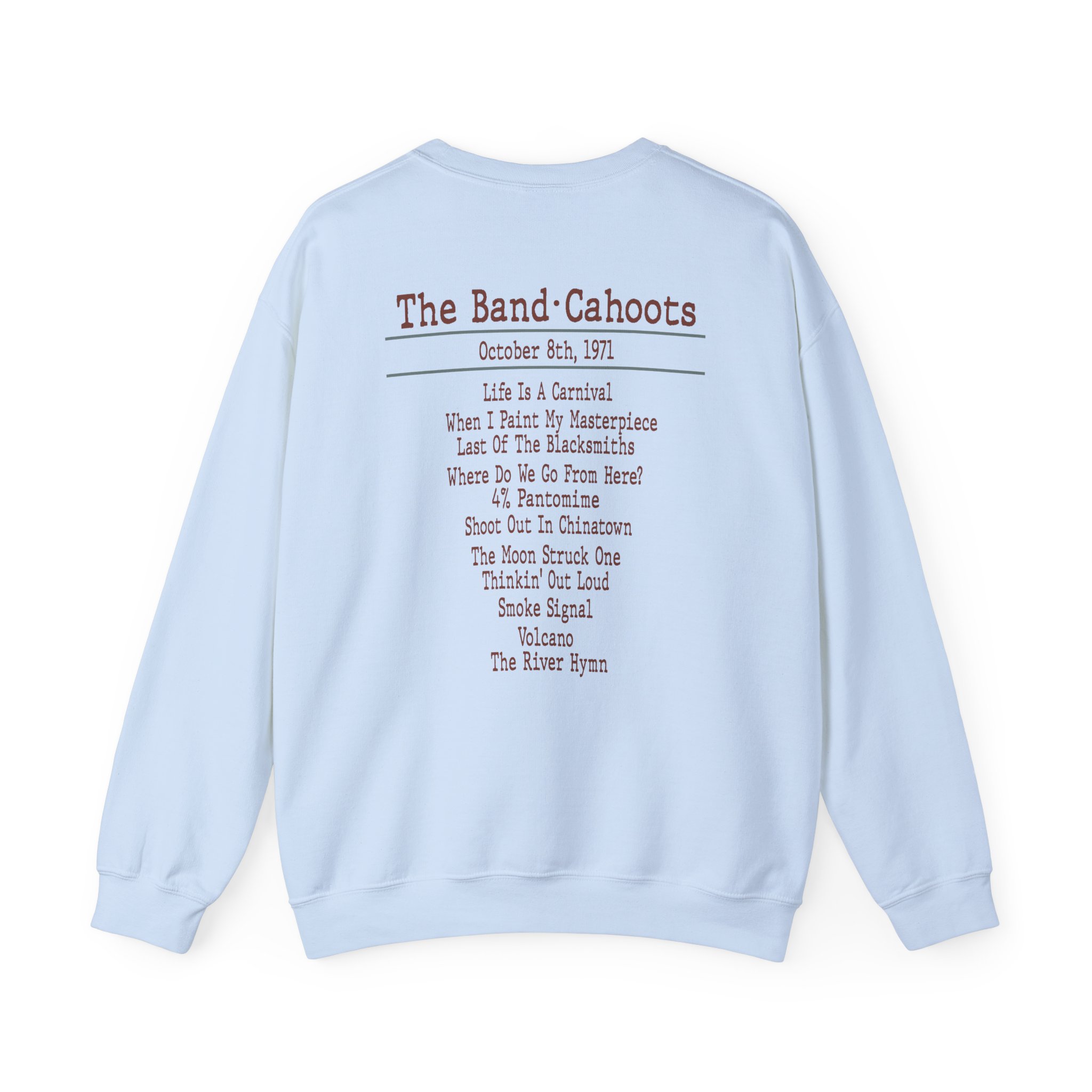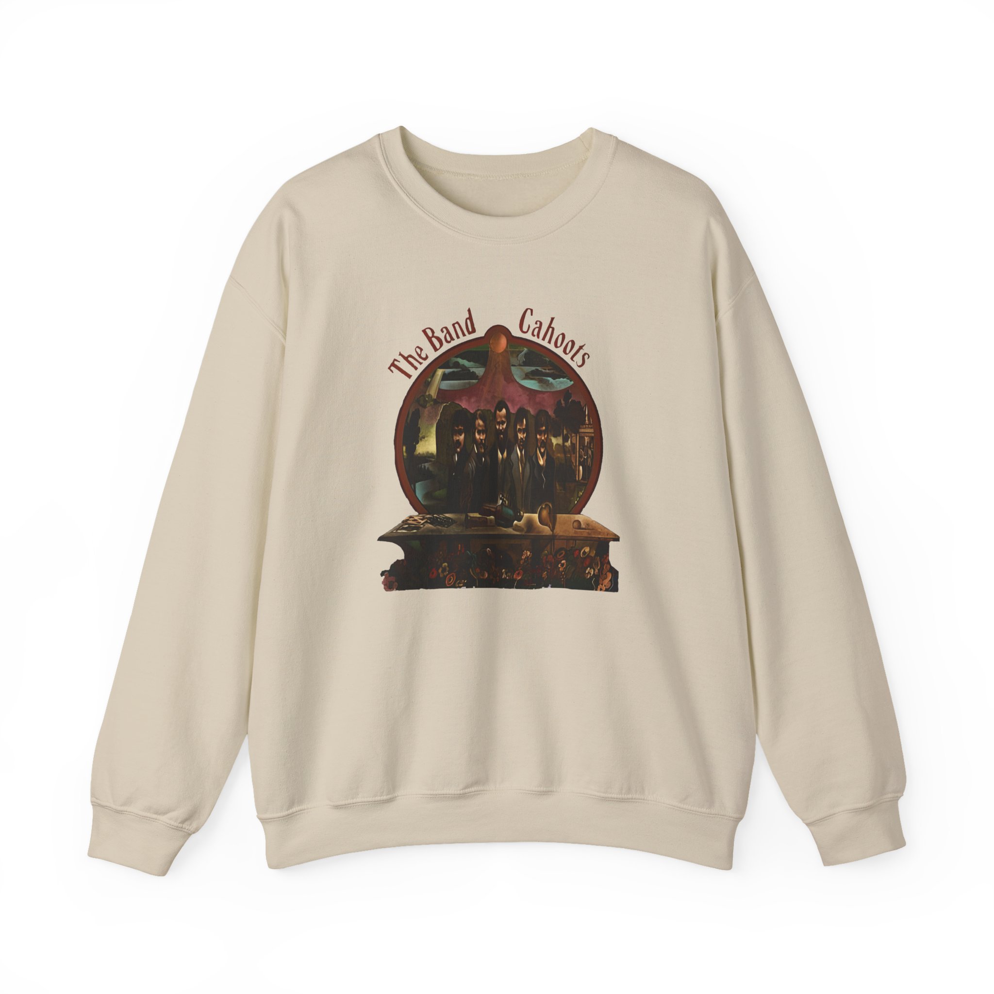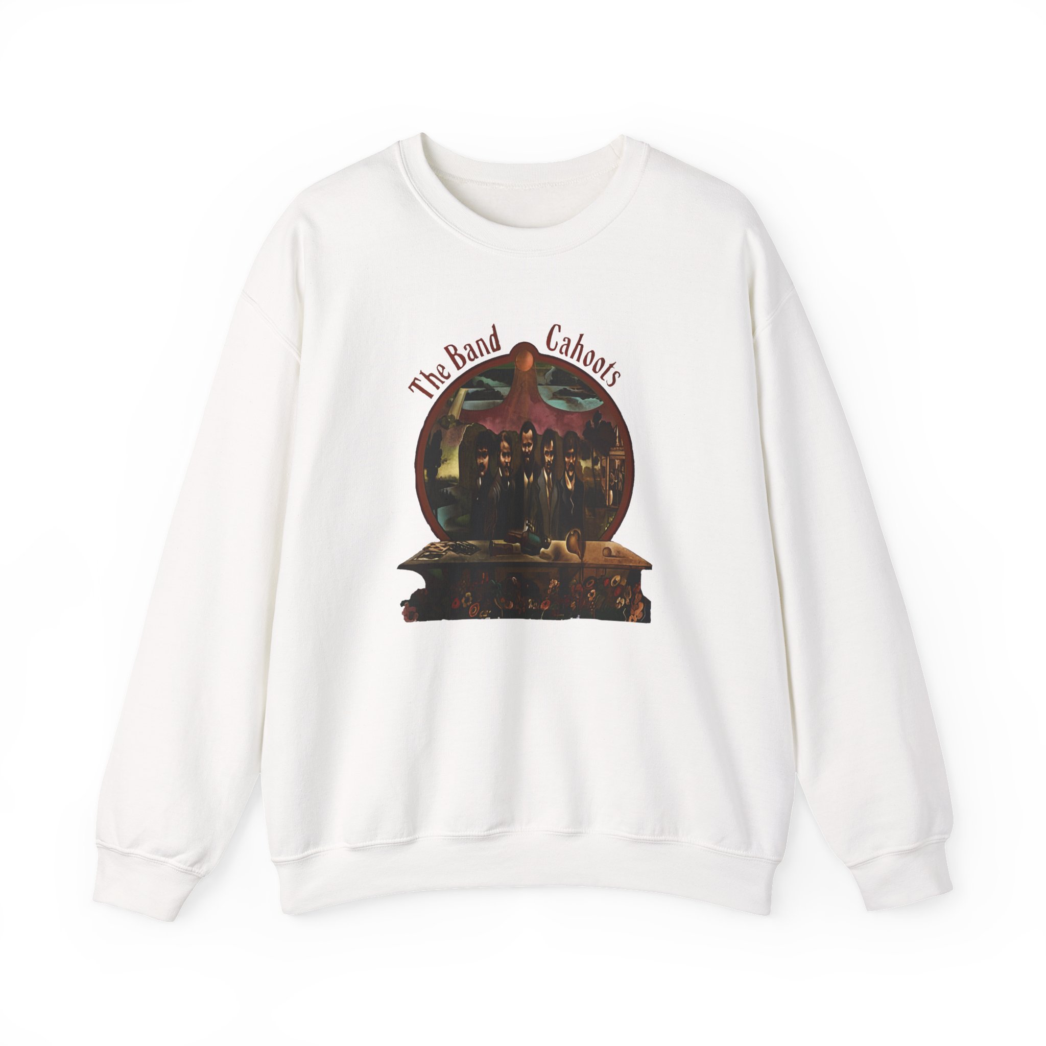 Ideal for any situation, a The Band Cahoots 50th Anniversary unisex heavy blend crewneck sweatshirt is pure comfort. These garments are made from polyester and cotton. This combination helps designs come out looking fresh and beautiful. The collar is ribbed knit, so it retains its shape even after washing. There are no itchy side seams on these sweaters.