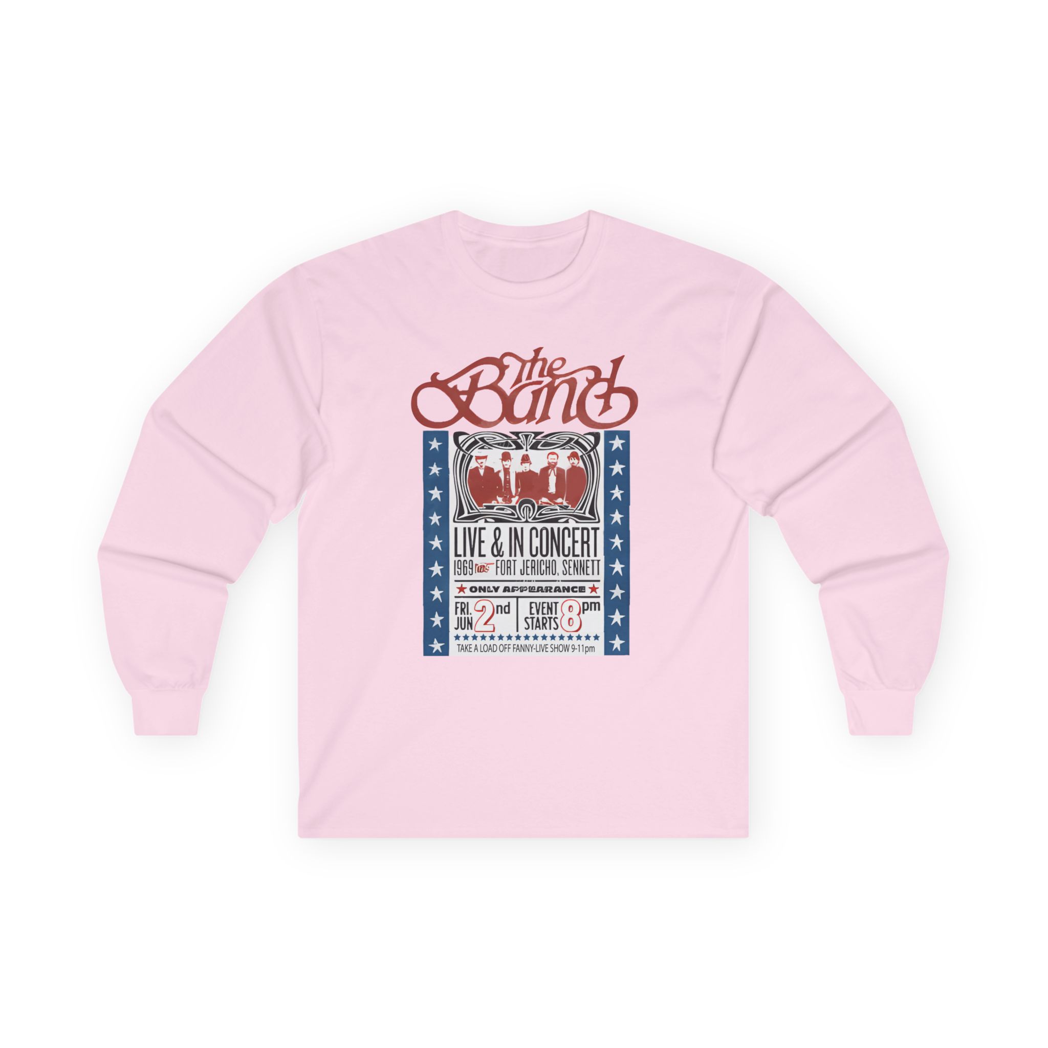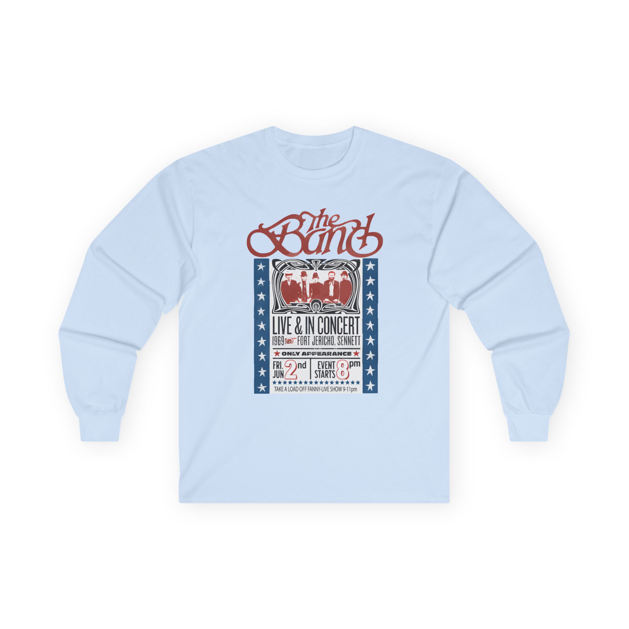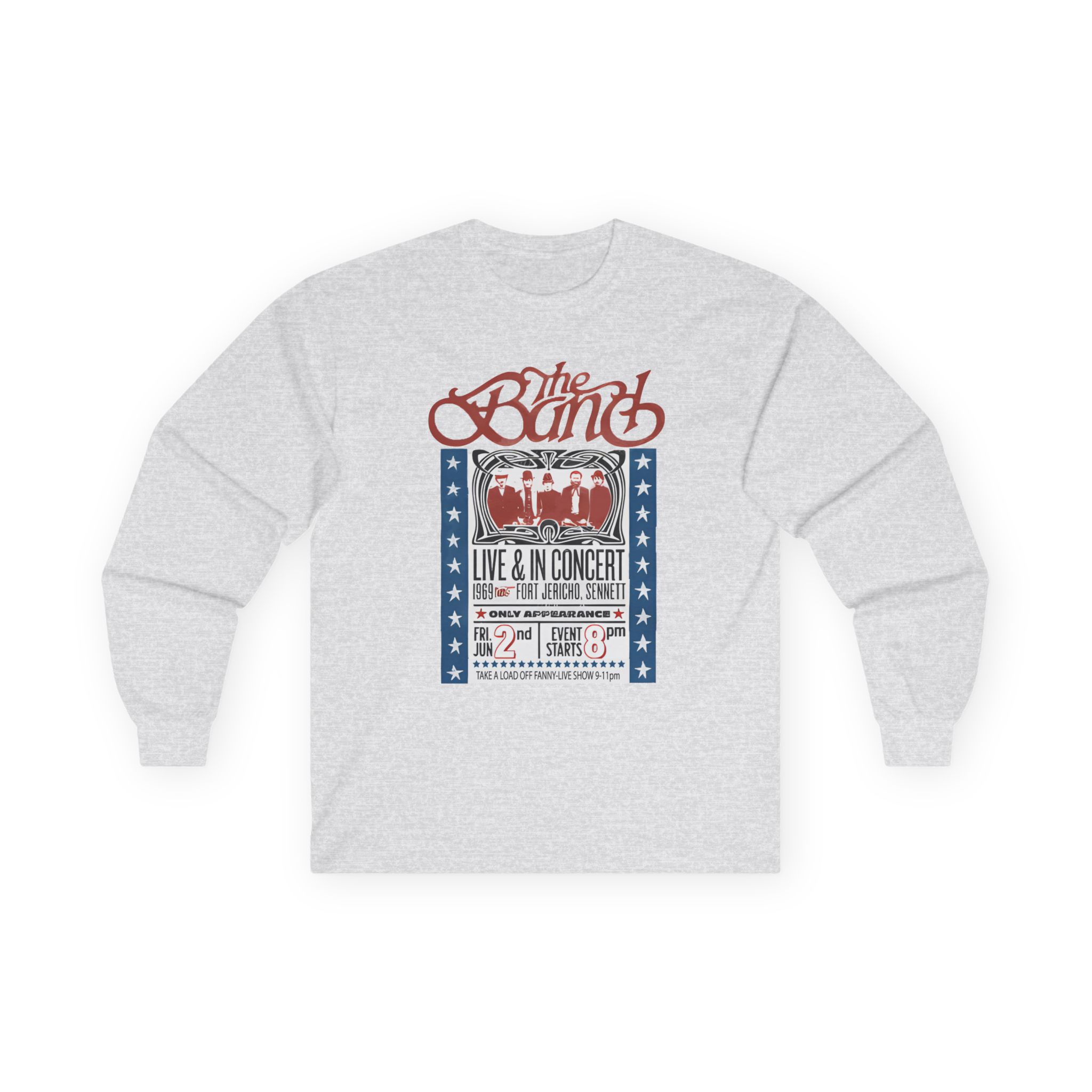 A bit more formal than a standard-issue t-shirt, the The Band Live in Concert ultra cotton long sleeve tee is a clear comfort winner. The sleeves also act as a nice frame. There are no side seams. The shoulders are taped for improved durability. This makes for a good fitting around the shoulders and neck. The cotton used for these shirts is environmentally friendly.