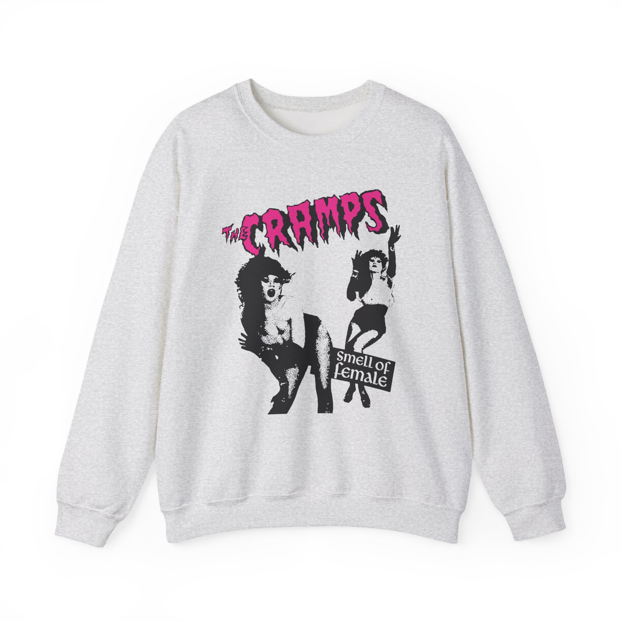 Ideal for any situation, a The Cramps Smell of Female unisex heavy blend crewneck sweatshirt is pure comfort. These garments are made from polyester and cotton. This combination helps designs come out looking fresh and beautiful. The collar is ribbed knit, so it retains its shape even after washing. There are no itchy side seams on these sweaters.