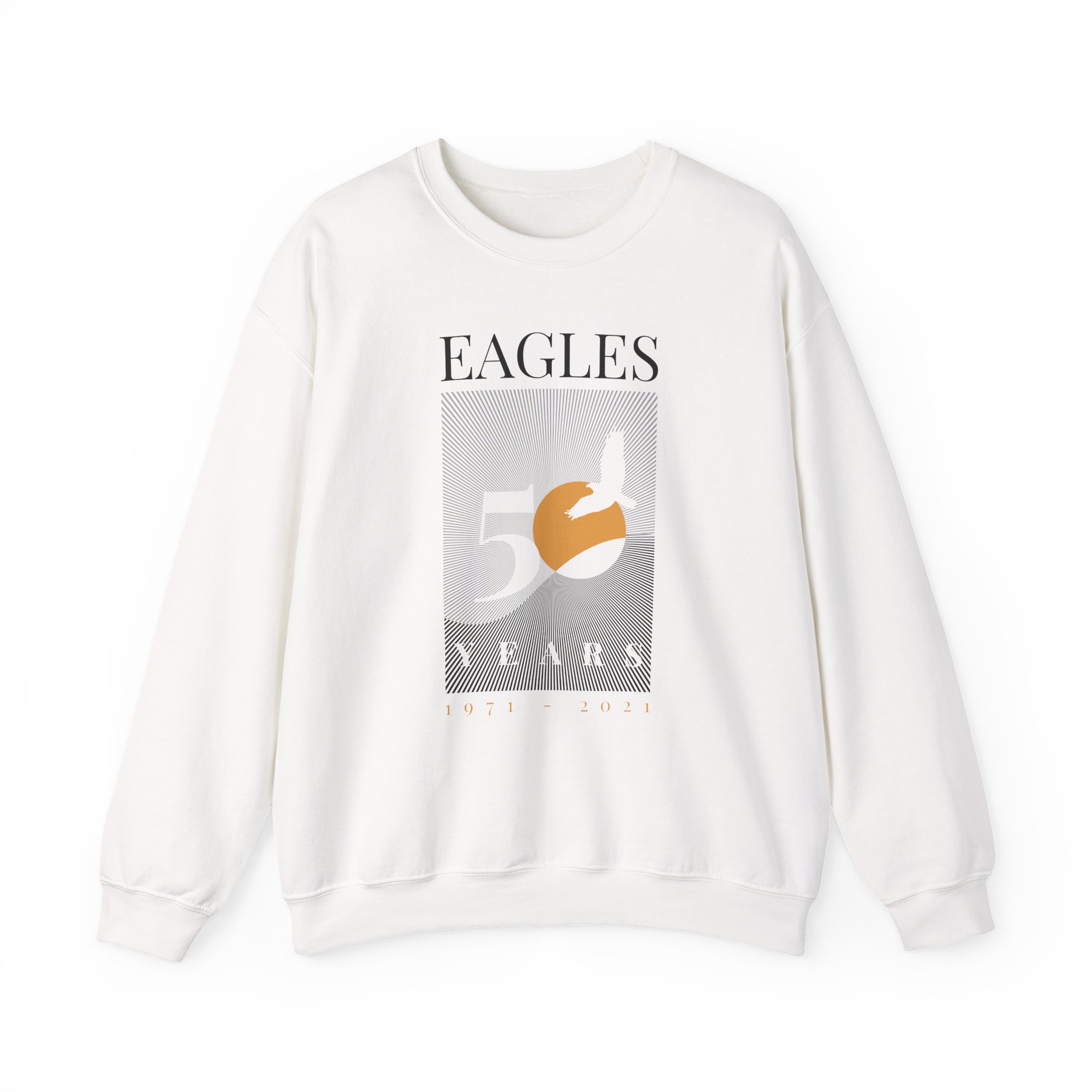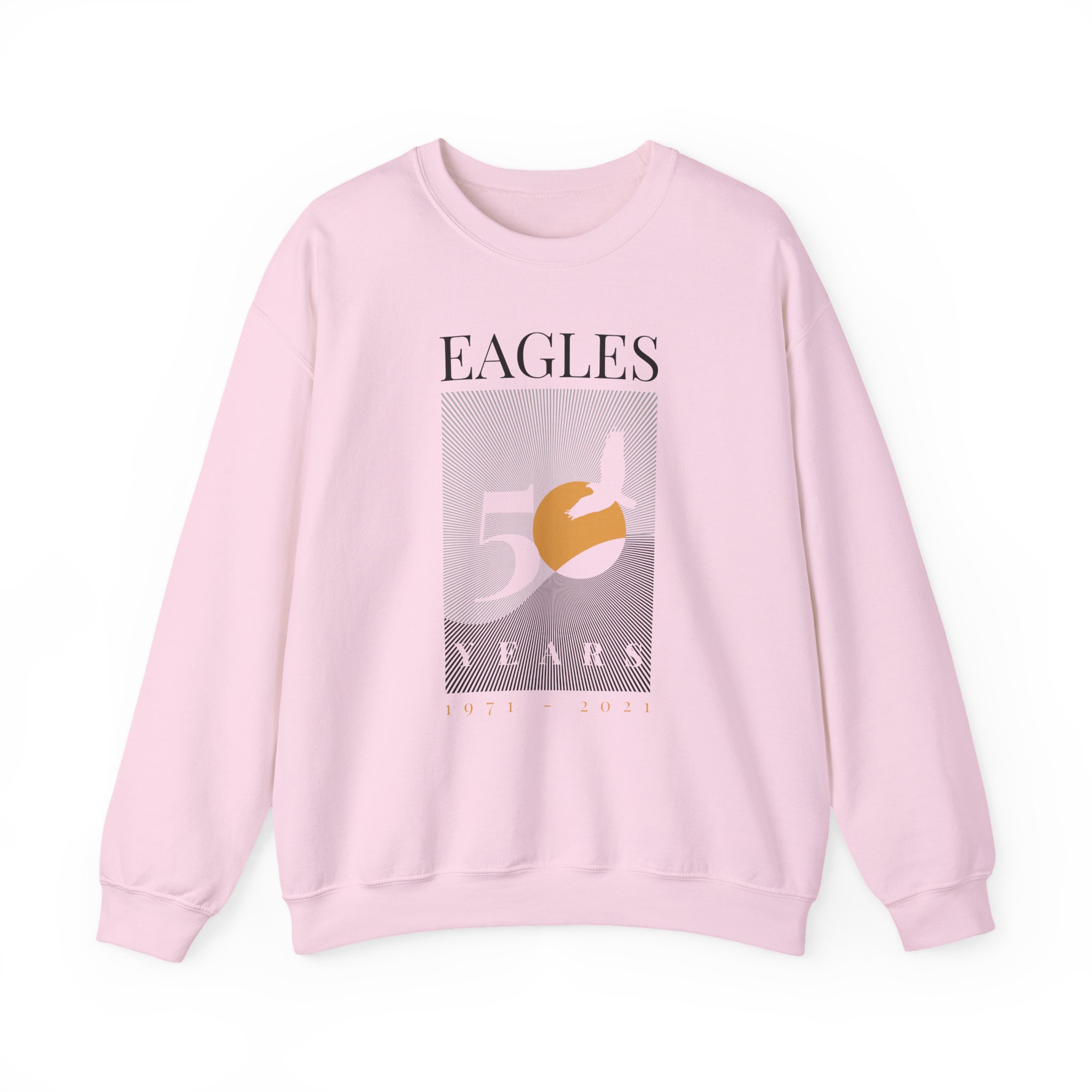 Ideal for any situation, The Eagles 50 Years Sunriseunisex heavy blend crewneck sweatshirt is pure comfort. These garments are made from polyester and cotton. This combination helps designs come out looking fresh and beautiful. The collar is ribbed knit, so it retains its shape even after washing. There are no itchy side seams on these sweaters.